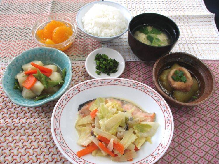 ご飯、かきたま汁、鮭のチャンチャン焼き、焼きなすと棒麩の生姜煮、金平ポテト、