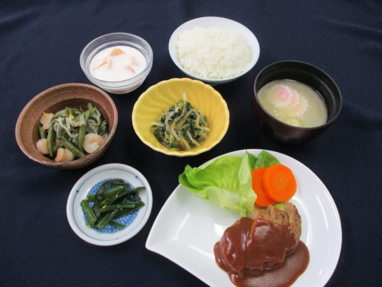 ご飯、なるととねぎのみそ汁、ハンバーグデミソース、いんげんとえびの炒め物、ほうれん草ともやしのナムル、わかめ磯漬、ピーチヨーグルト