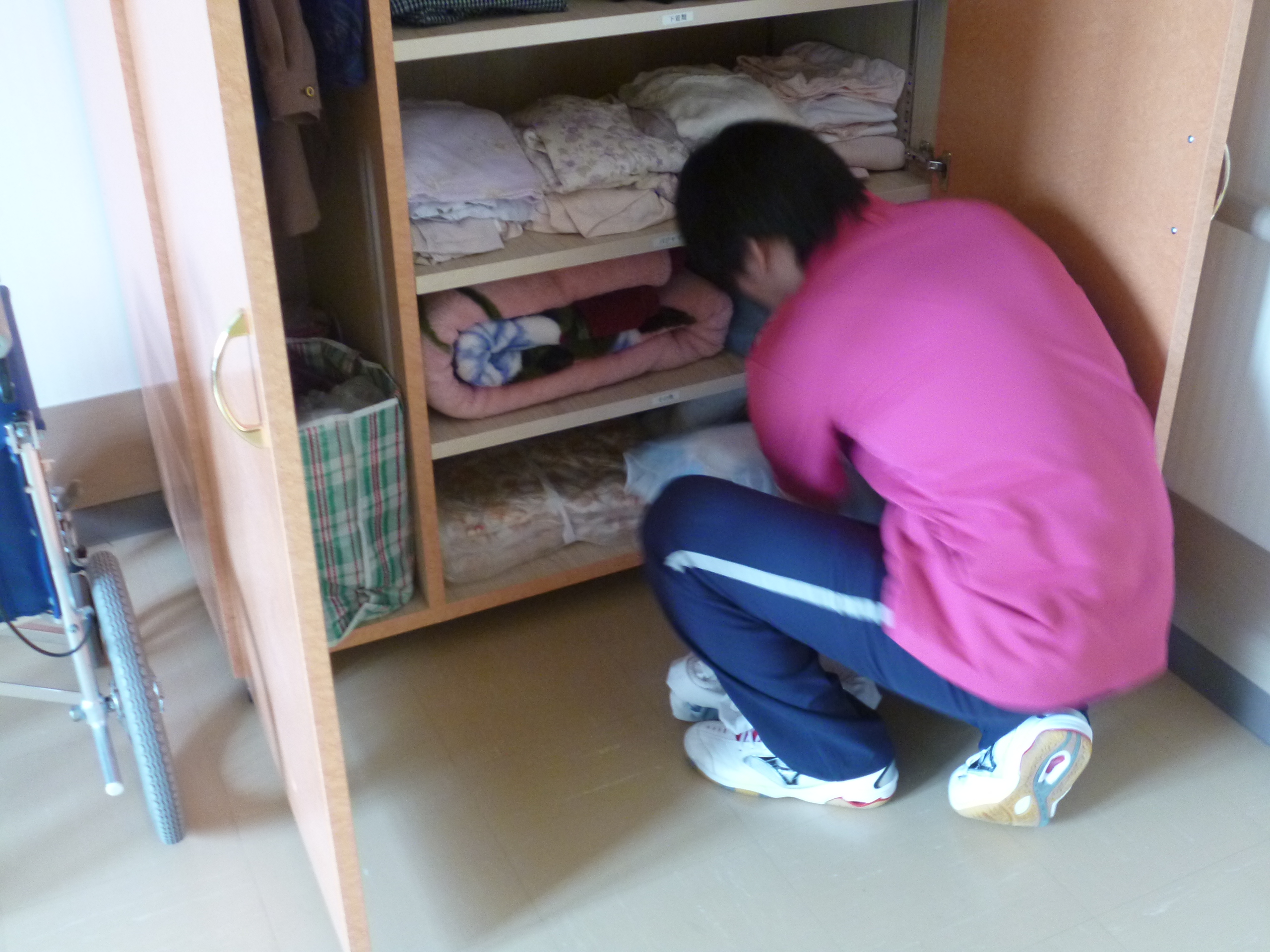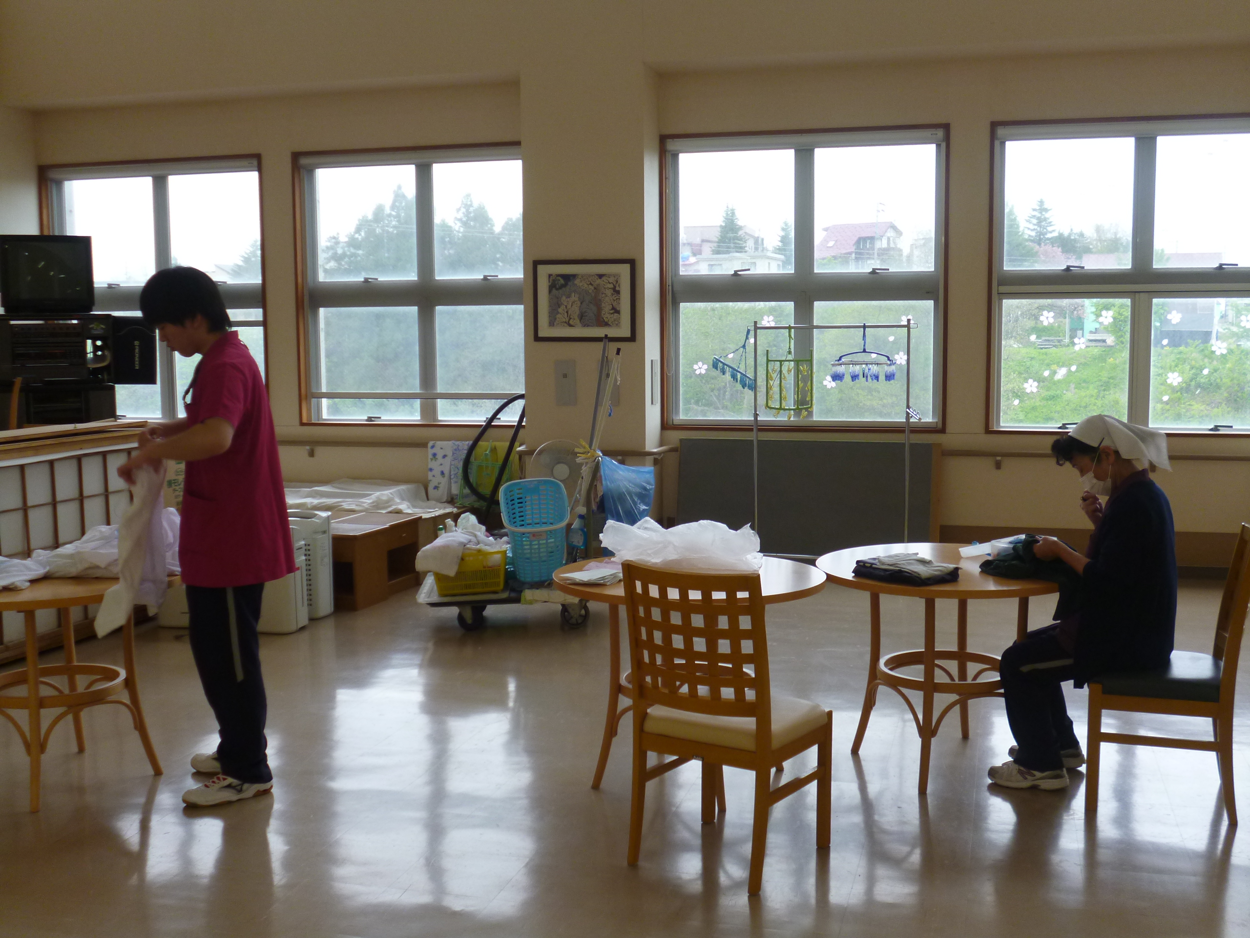 午後の作業風景です。左は新人さんによる業者洗濯の返却です。右は、大ベテランさんです。服のほころびを修正しています.