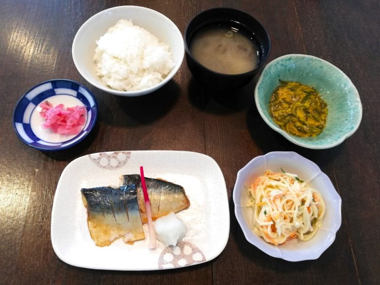 ごはん、さもだしのみそ汁、さばの生姜醤油焼き、スパゲティサラダ、めかぶとろろ和え、梅吹雪