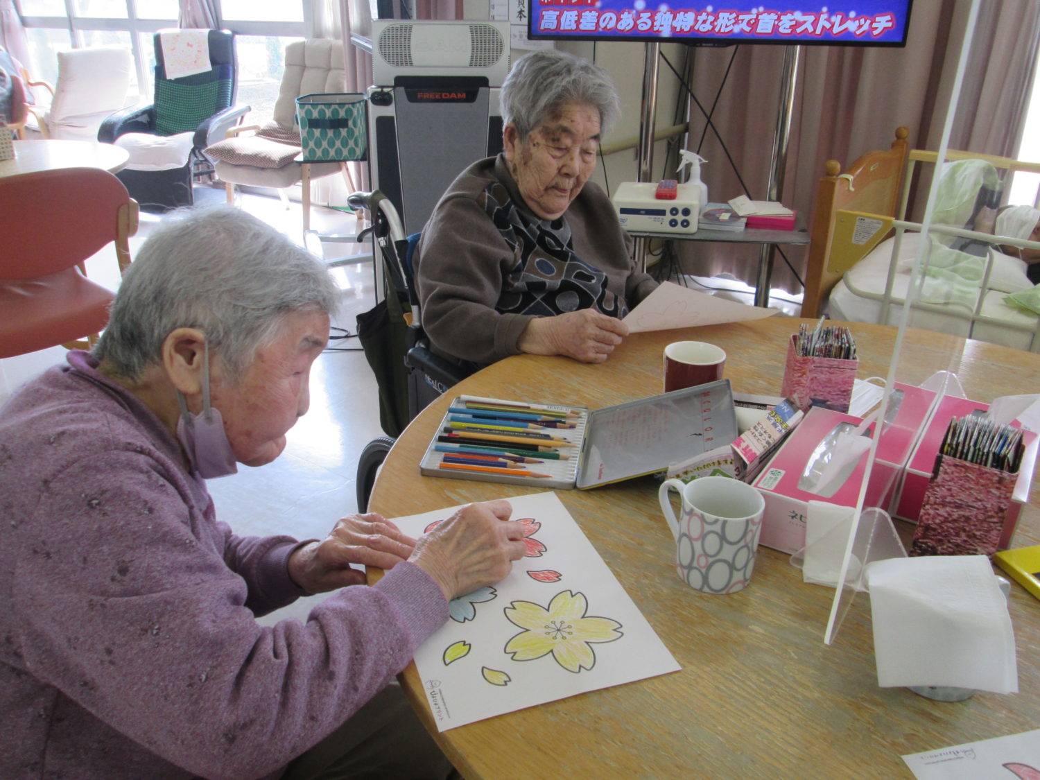 また、塗り絵に参加された方は桜の塗り絵をして壁を満開の桜に仕上げようと一生懸命頑張っておりました。おかげ様でもうすぐ満開の桜が出来上がります。