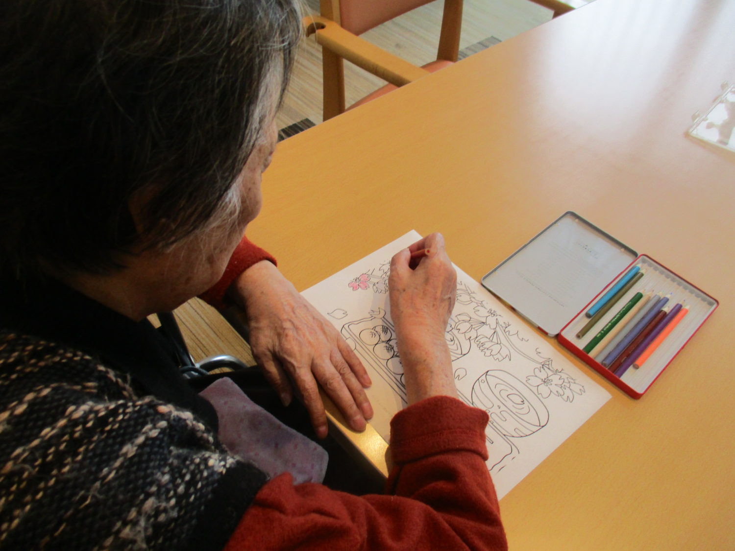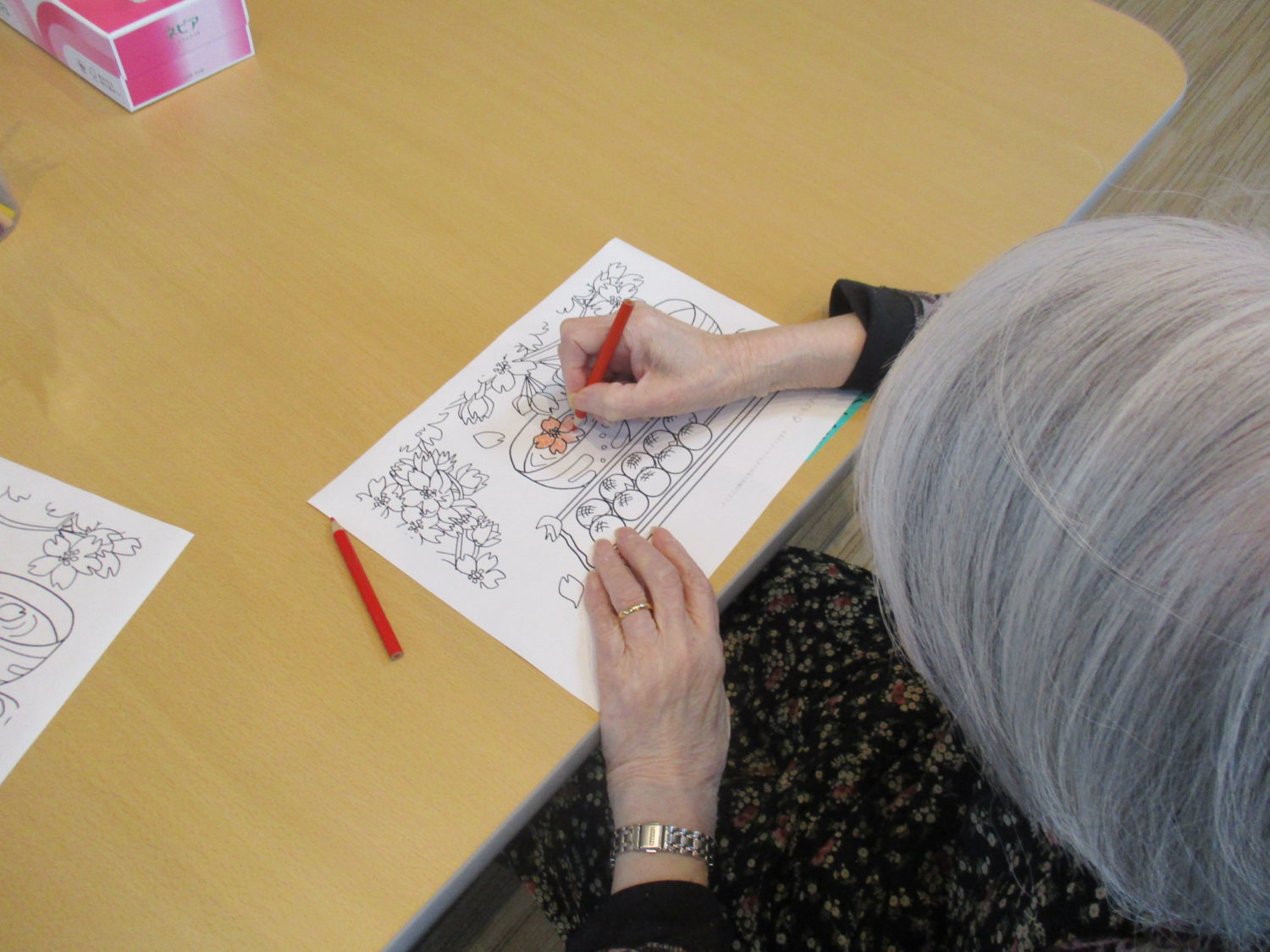 ブログをご覧の皆様こんばんは。本日のレクリエーション活動はお客様方に桜や団子の色を塗って頂きましたのでその様子をご紹介します。