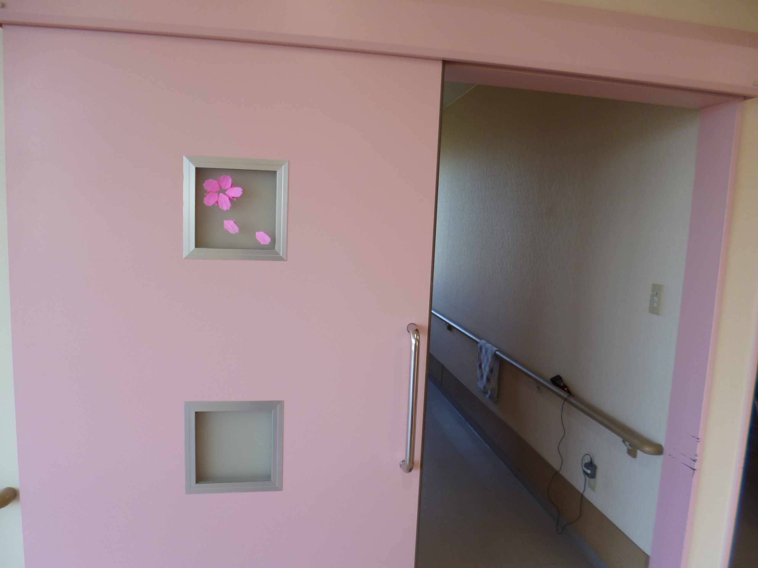 桜の花びらや鶴といったのを各階の扉に飾っています。