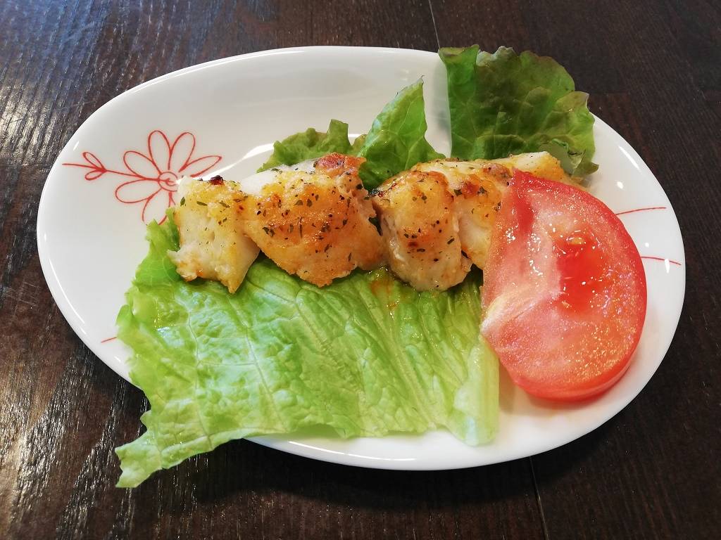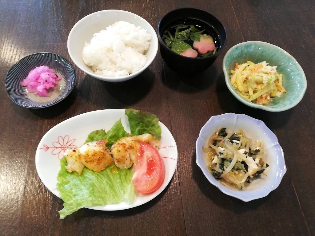 ごはん、花麩のすまし汁、白身魚のガーリックチーズ焼き、生揚げの炒め物、さつま芋のサラダ、