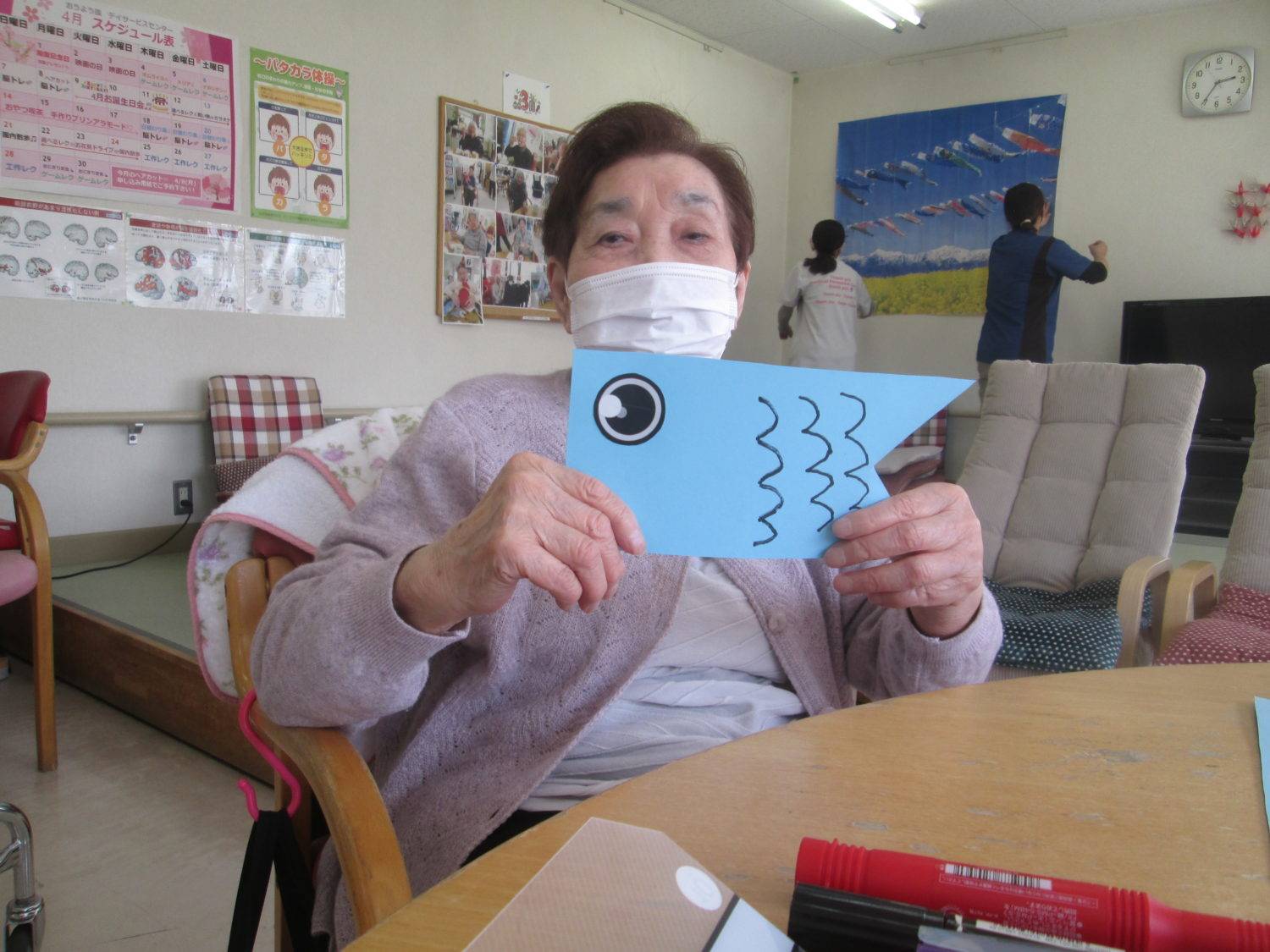 早速作成にとりかかって頂き、頭を抱えながら皆様とても個性ある作品となりました。職員も負けずにこいのぼりの絵を壁に貼らせて頂きました。