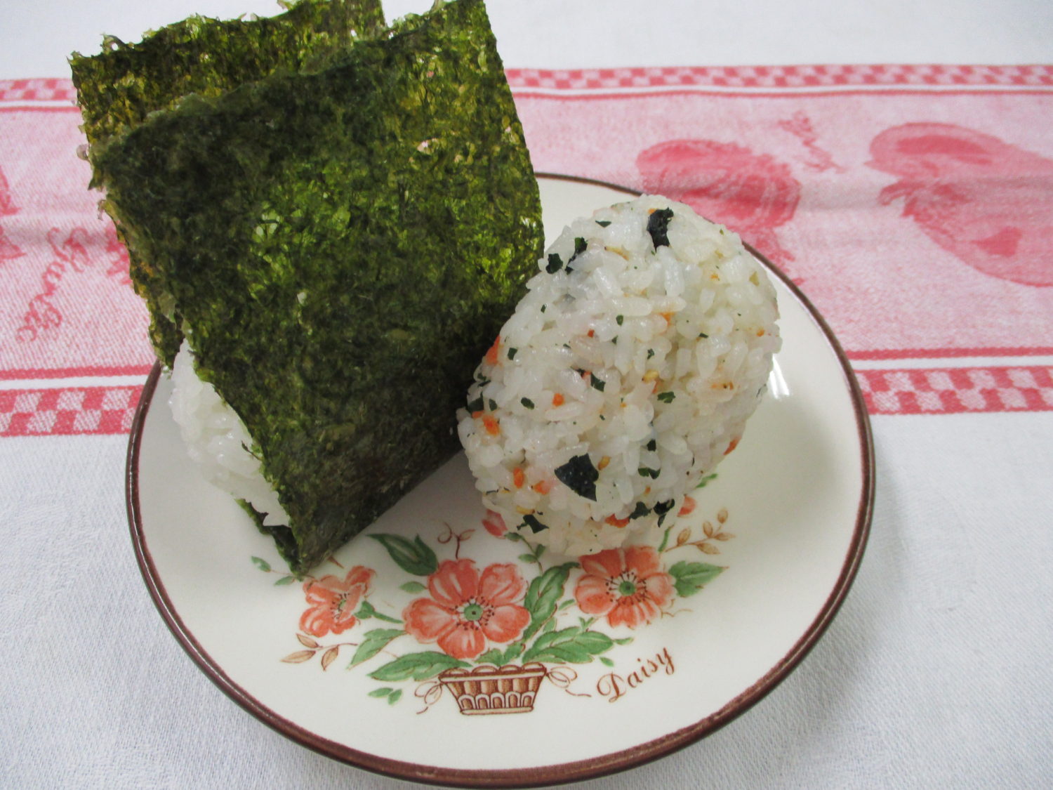 鮭わかめおにぎり、梅おにぎり、鶏肉の竜田揚げ、カリフラワーのカレー炒め、オクラとぶなぴーのおろし和え、なす漬、ラブレ