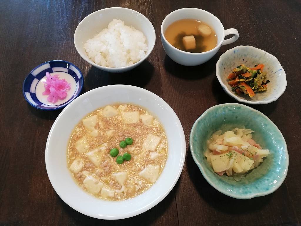 ごはん、麩のスープ、麻婆豆腐、リヨネーズポテト、青梗菜のごま和え、桜大根漬け