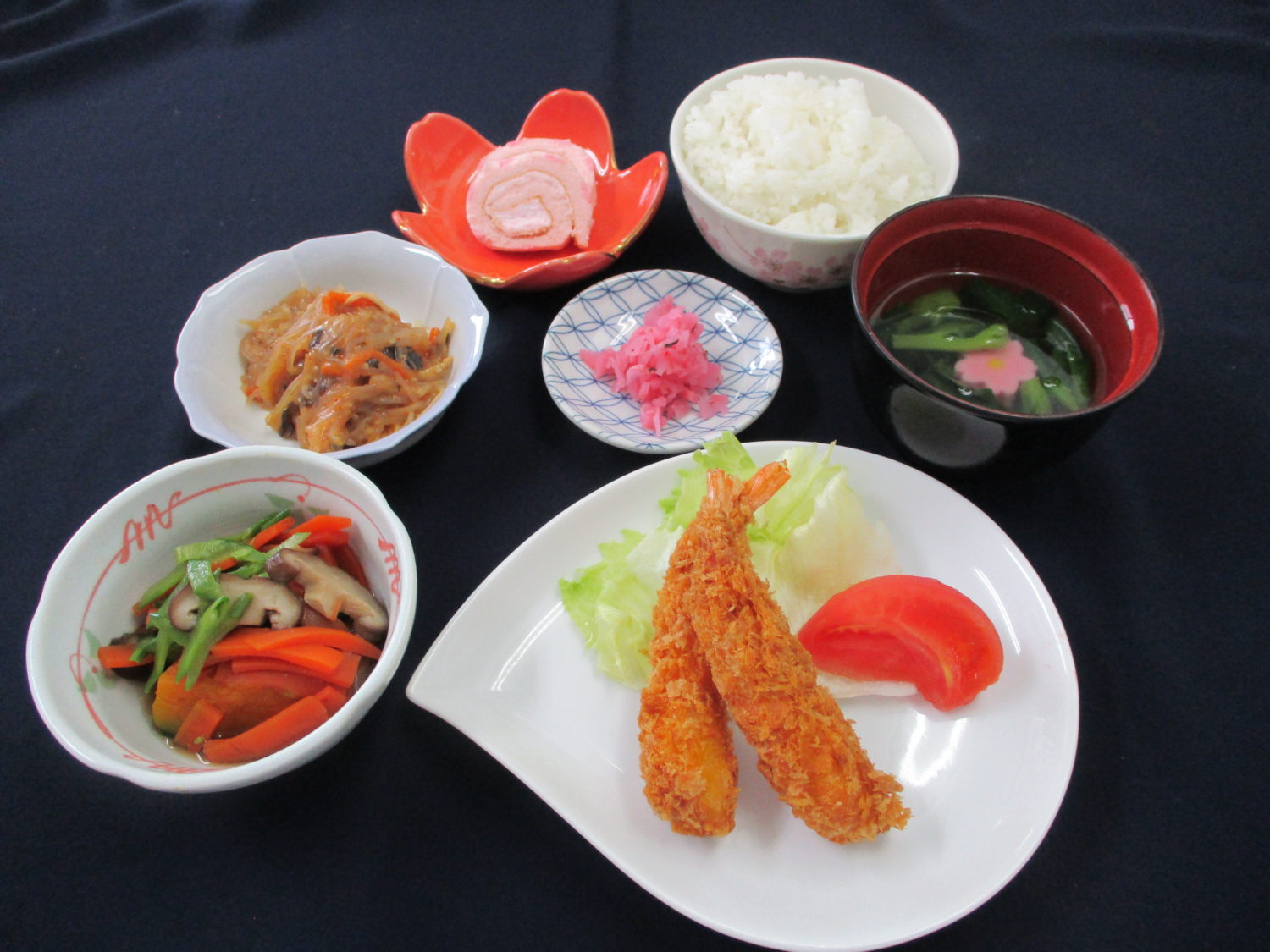 ご飯、菜の花と生麩の清汁、えびフライ、南瓜の含め煮、春雨サラダ中華風、梅吹雪漬、いちごロールケーキ