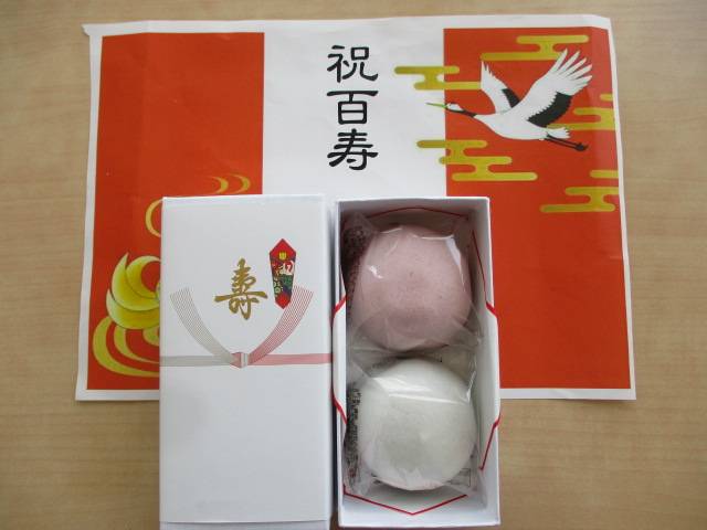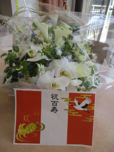 先日孫様、ひ孫様よりとても豪華な花束のプレゼントとお客様全員、それに私達職員にまでお祝いの紅白饅頭を届けて下さいました。