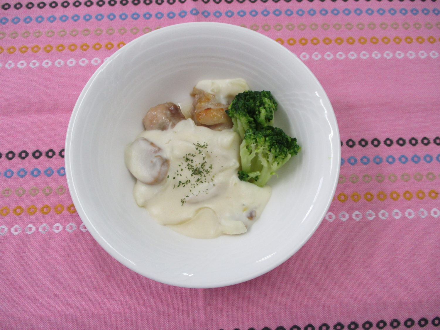 ミニクロワッサン、キャベツとコーンのスープ、チキンソテーホワイトソース、アスパラといかのソテー、帆立風味フライ、なた割大根漬、プリン