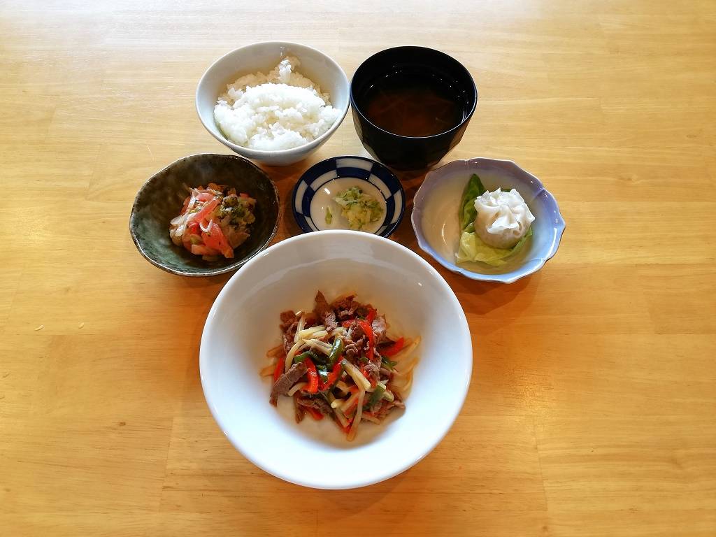 ごはん、中華風スープ、青椒肉絲、野菜しゅうまい、ブロッコリーのサラダ、キャベツ漬け