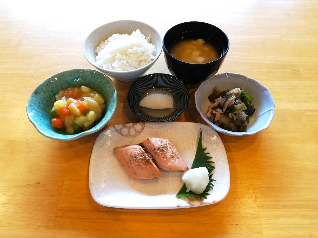 ごはん、豆腐のみそ汁、鮭の利休焼き、なすの炒め物、練り込み、べったら漬け