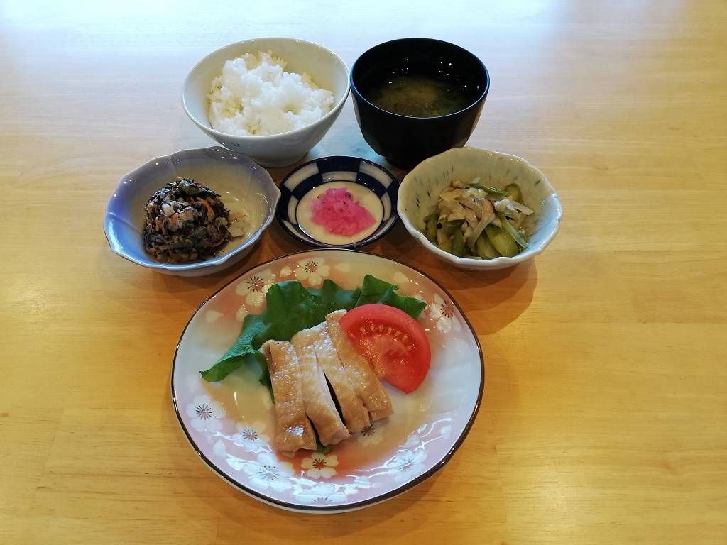 ごはん、大根葉のみそ汁、鶏肉の生姜焼き、アスパラバター炒め、ひじきのサラダ、桜大根漬け