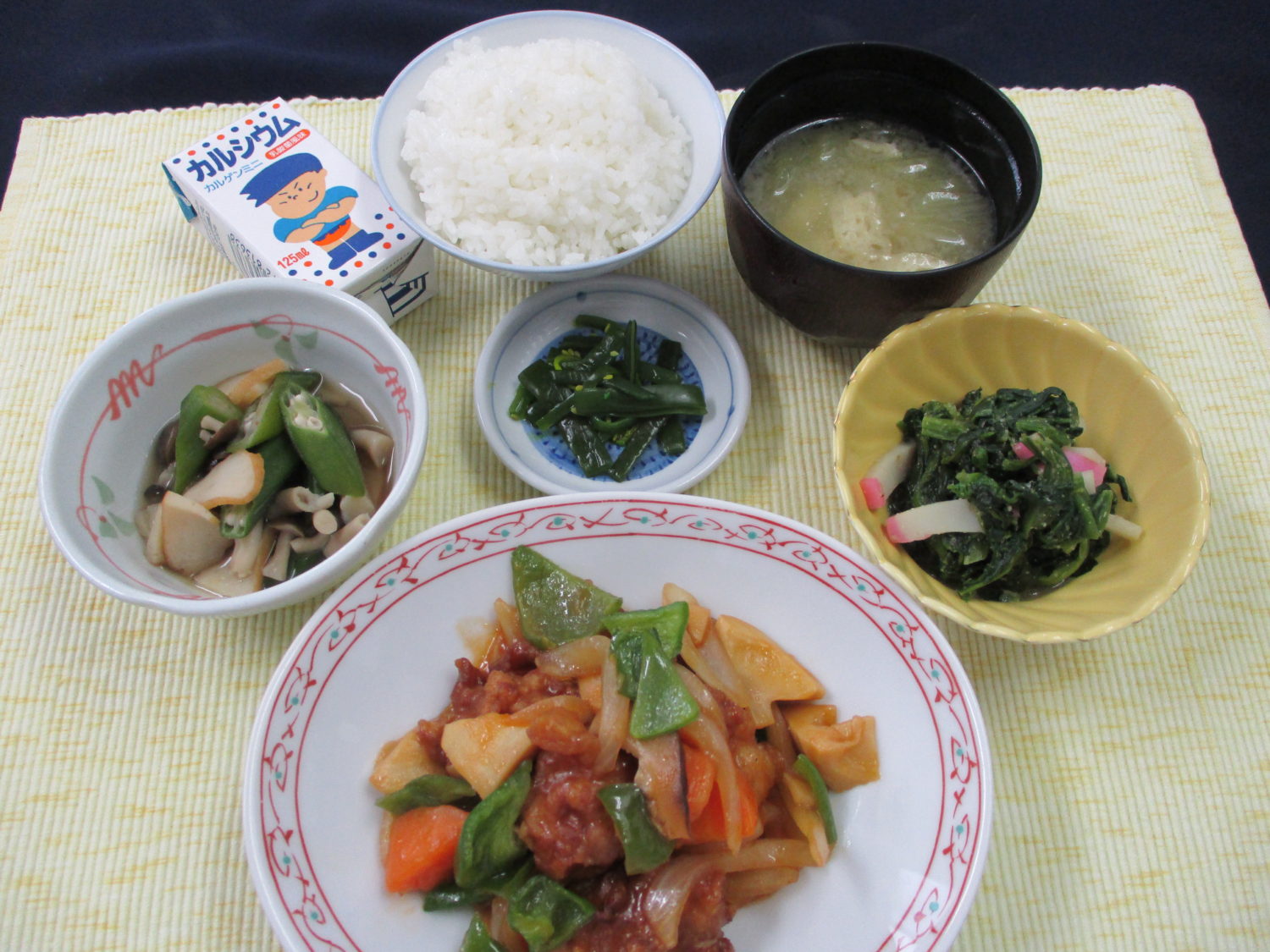 ご飯、ふきと油揚げのみそ汁、酢豚、ほうれん草のごま和え、オクラとさつま揚げの煮物、わかめ磯漬、カルゲンミニ