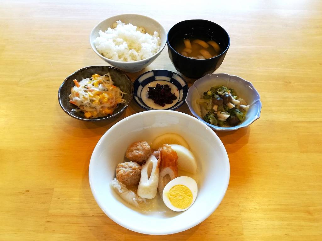 ごはん、板麩のみそ汁、おでん、ブロッコリーソテー、彩り春雨サラダ、しば漬け