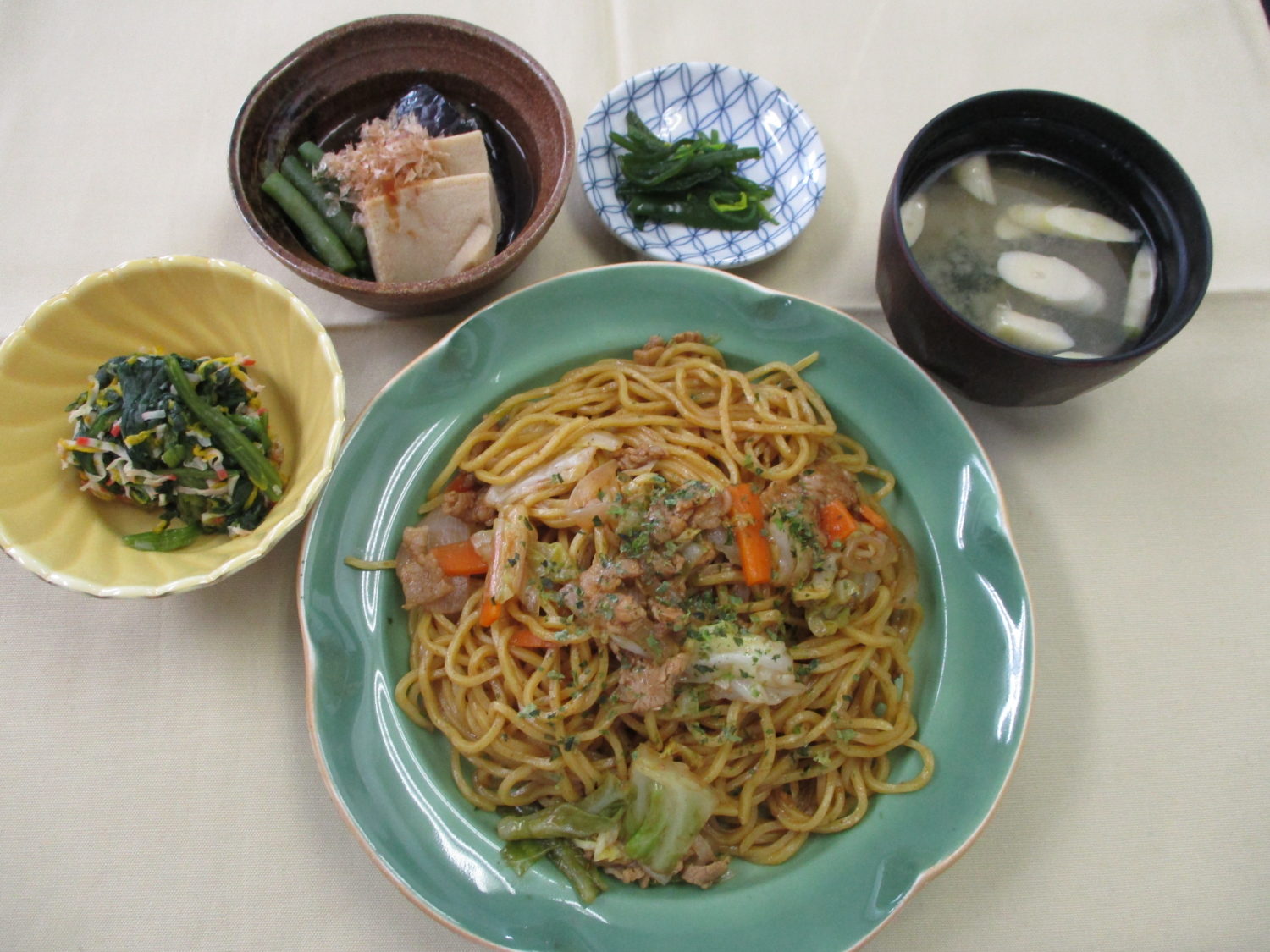 焼きそば、細竹とわかめのみそ汁、なすと高野豆腐の煮つけ、ほうれん草とカニカマの和え物、 わかめ磯漬