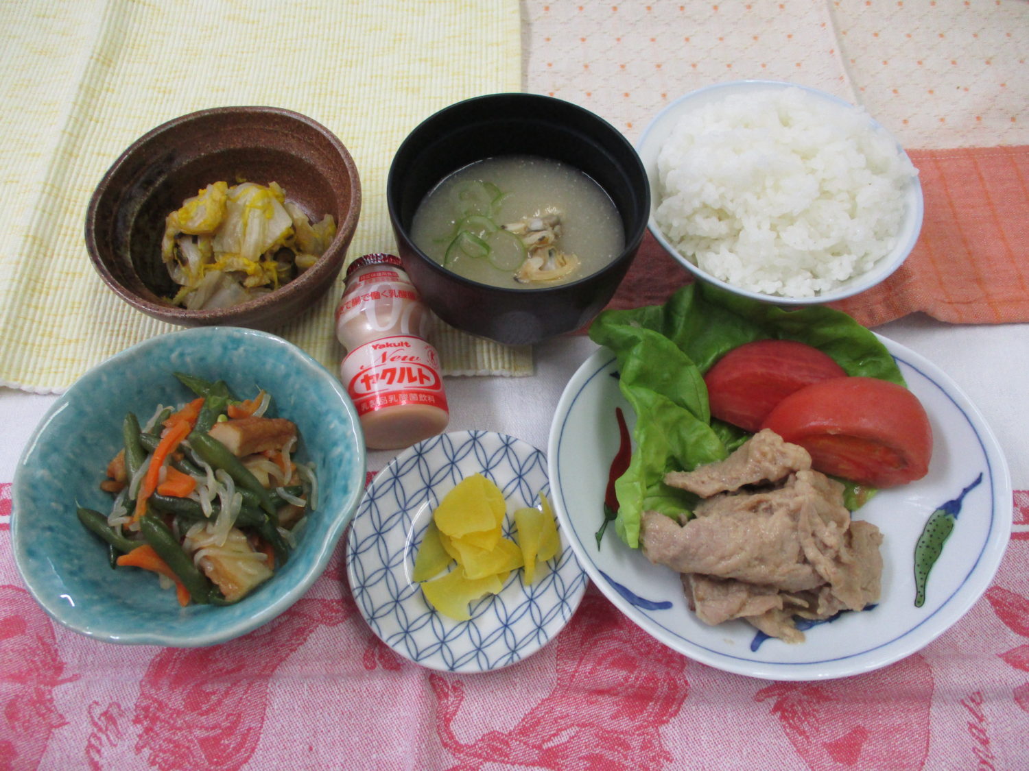 ご飯、あさりとねぎのみそ汁、豚肉のバター醤油焼き、いんげんとさつま揚げの炒め煮、白菜のさざなみ和え、かつおたくあん漬、ヤクルト
