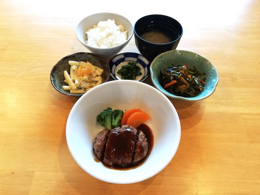 ごはん、キャベツのスープ、ハンバーグデミソース、すき昆布の煮物、マカロニサラダ、