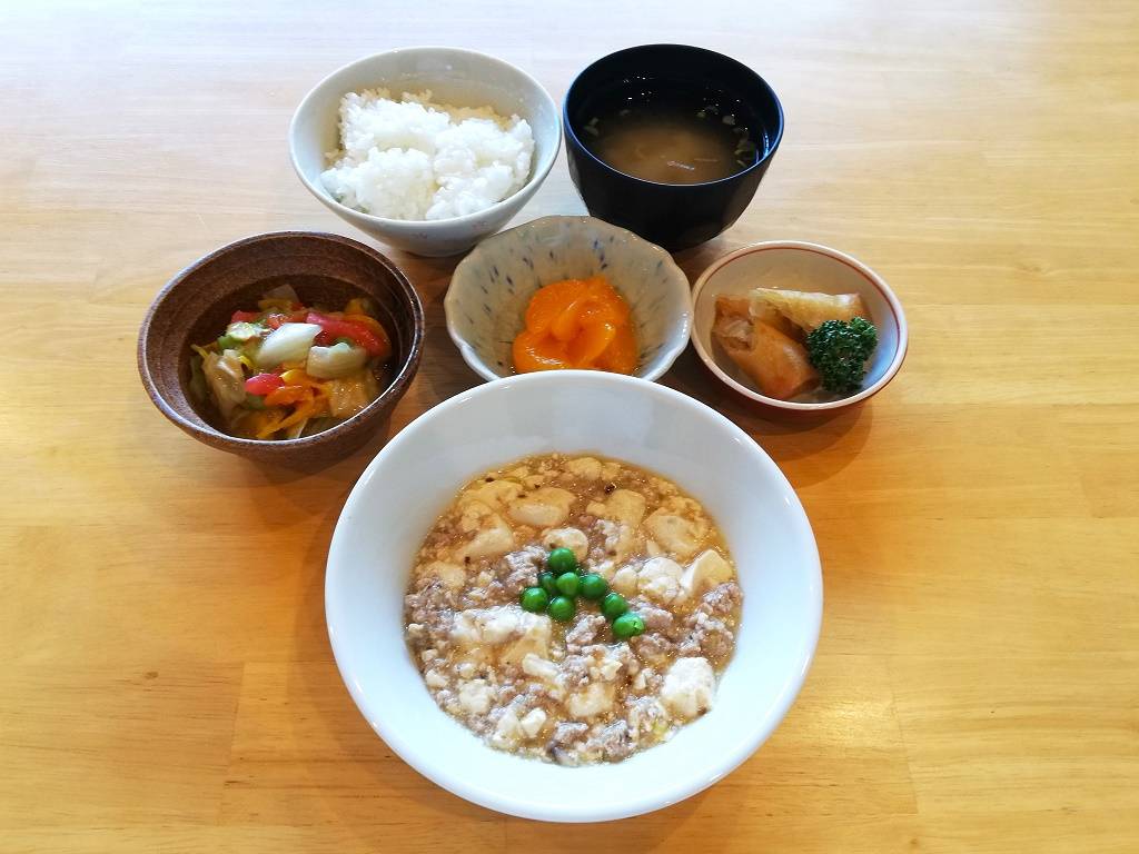 ごはん、ぶなぴーのみそ汁、麻婆豆腐、春巻き、レタスのサラダ、みかん缶