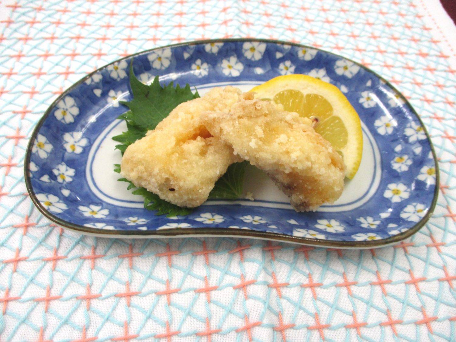 ご飯、えのきと油揚げのみそ汁、めばるの竜田揚げ、なすのケチャップ炒め、