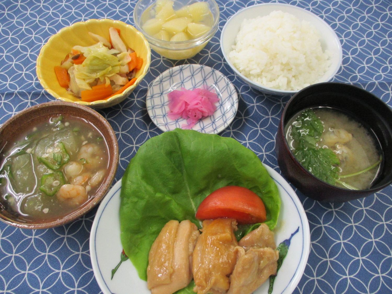 ご飯、あさりと三つ葉のみそ汁、鶏肉の照り焼き、冬瓜とえびのあんかけ、竹輪とキャベツの炒め物、桜大根漬、洋梨缶