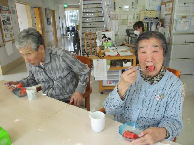 さて、本日の午後のお茶会にて、ご家族様よりいただいたスイカを提供しました。丸々とし、ジューシーなスイカに皆様も「スイカはいいなー」「美味しい」と大喜び。夏を感じるひと時となりました。