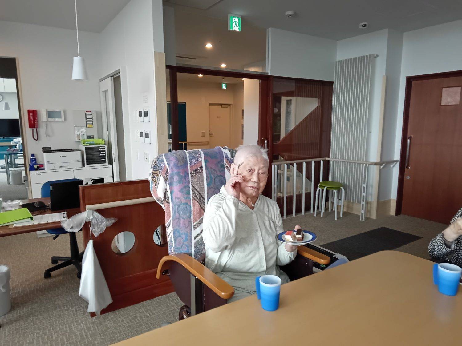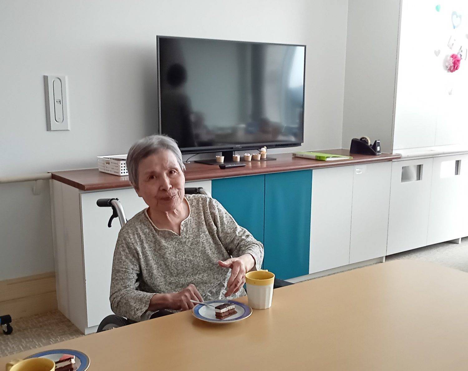 皆さんでコーヒーと誕生日ケーキを食べて