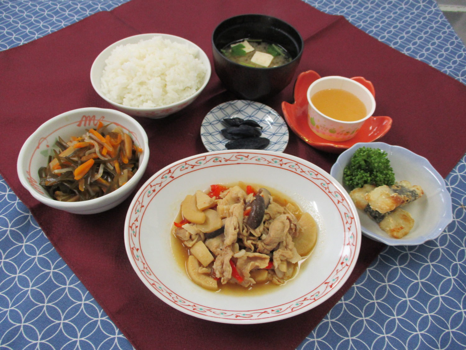 ご飯、焼き豆腐と三つ葉のみそ汁、豚肉とたけのこ中華炒め、すき昆布の炒め煮、ながいも短冊揚げ、なす漬、ももゼリー