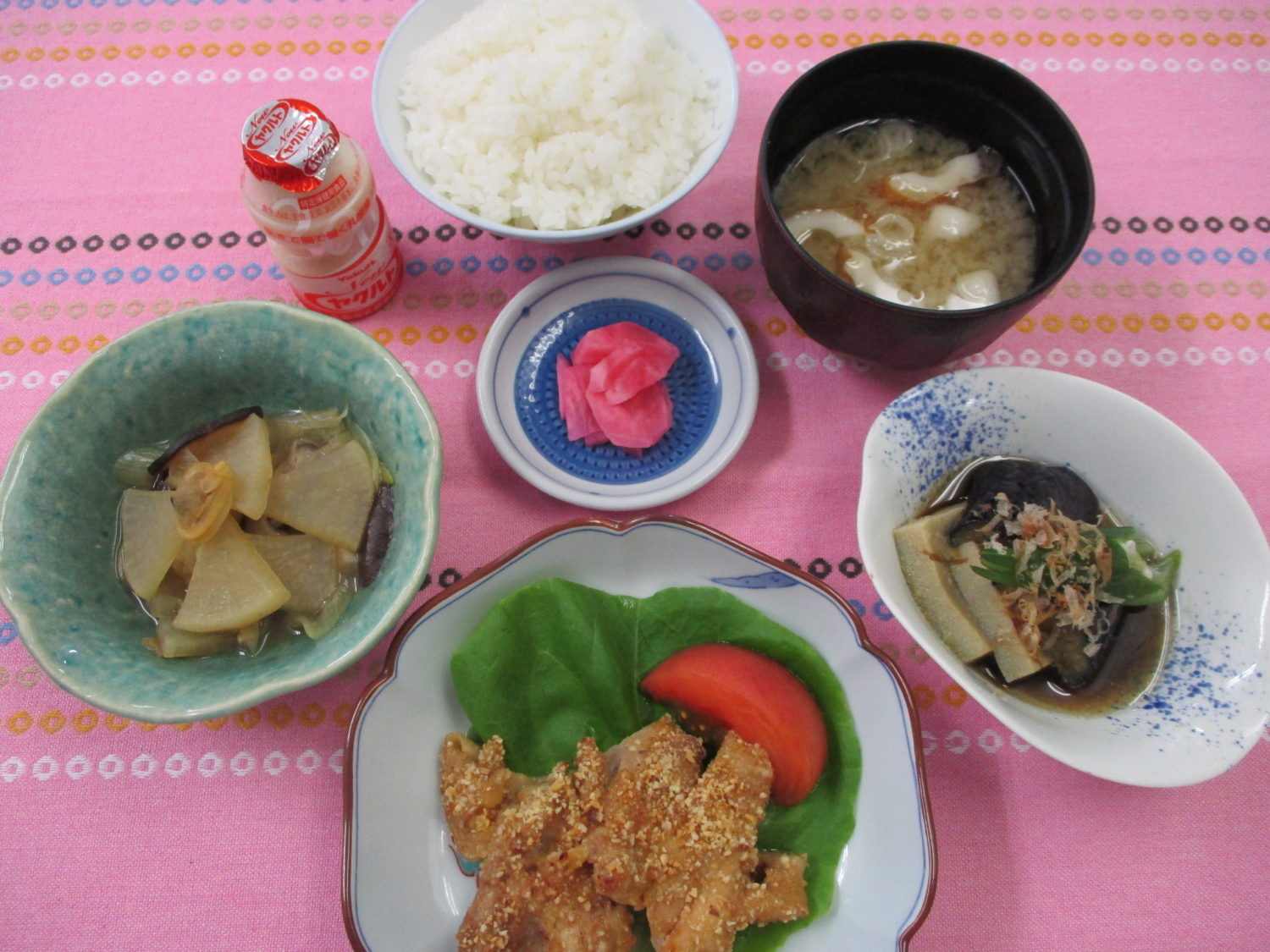 ご飯、竹輪とねぎのみそ汁、鶏肉のピーナッツ焼き、大根とあさりの炒め物、なすと高野豆腐の生姜煮、赤かぶ漬、ヤクルト