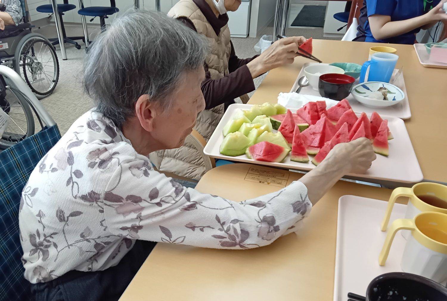 本日は、メロンとスイカの差し入れもあり、皆様とても喜んで、美味しそうに召し上がっていらっしゃいました。