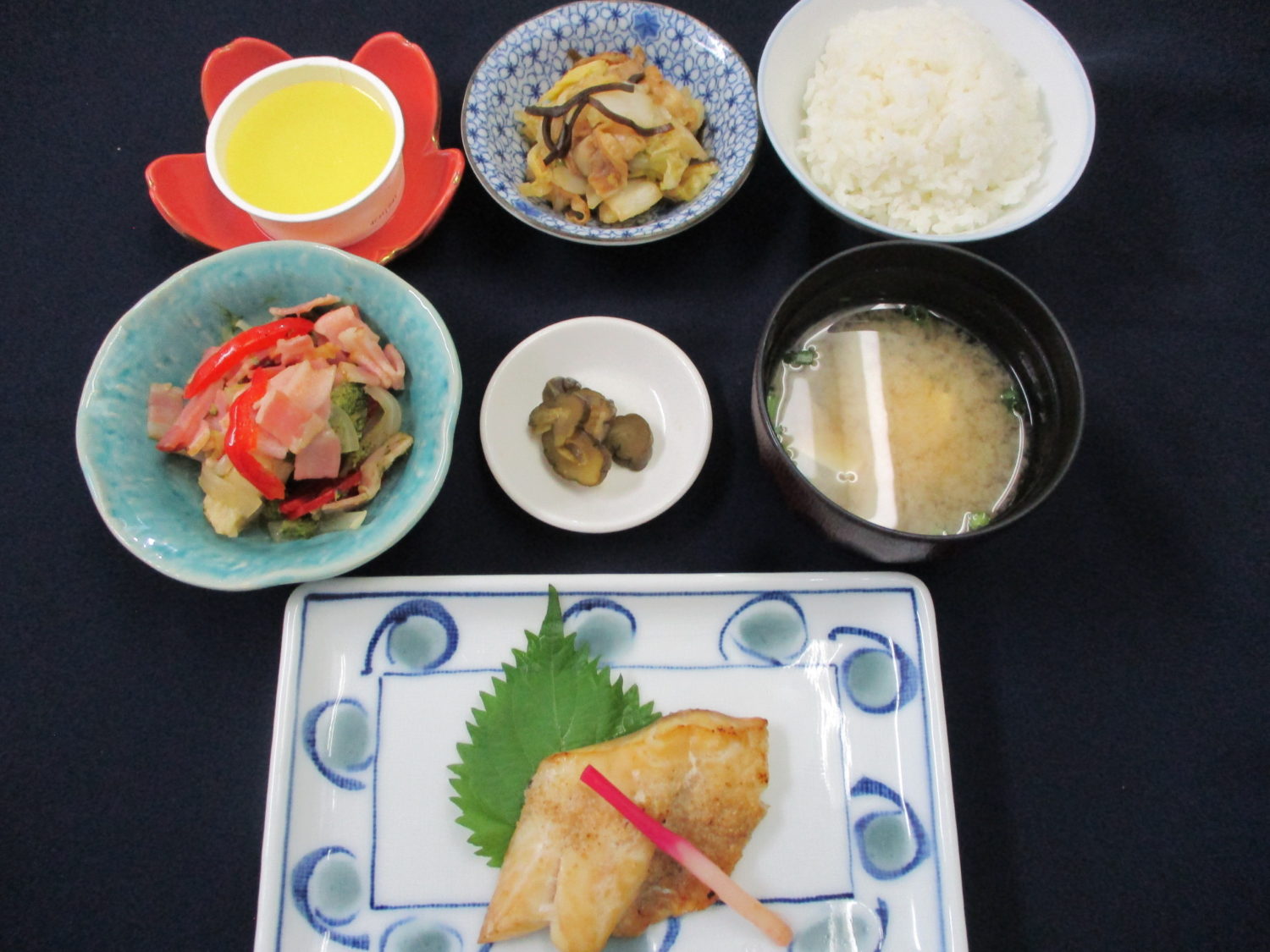 ご飯、焼き豆腐と万能ねぎのみそ汁、めばるの南部焼き、ブロッコリーと鶏肉のソテー、