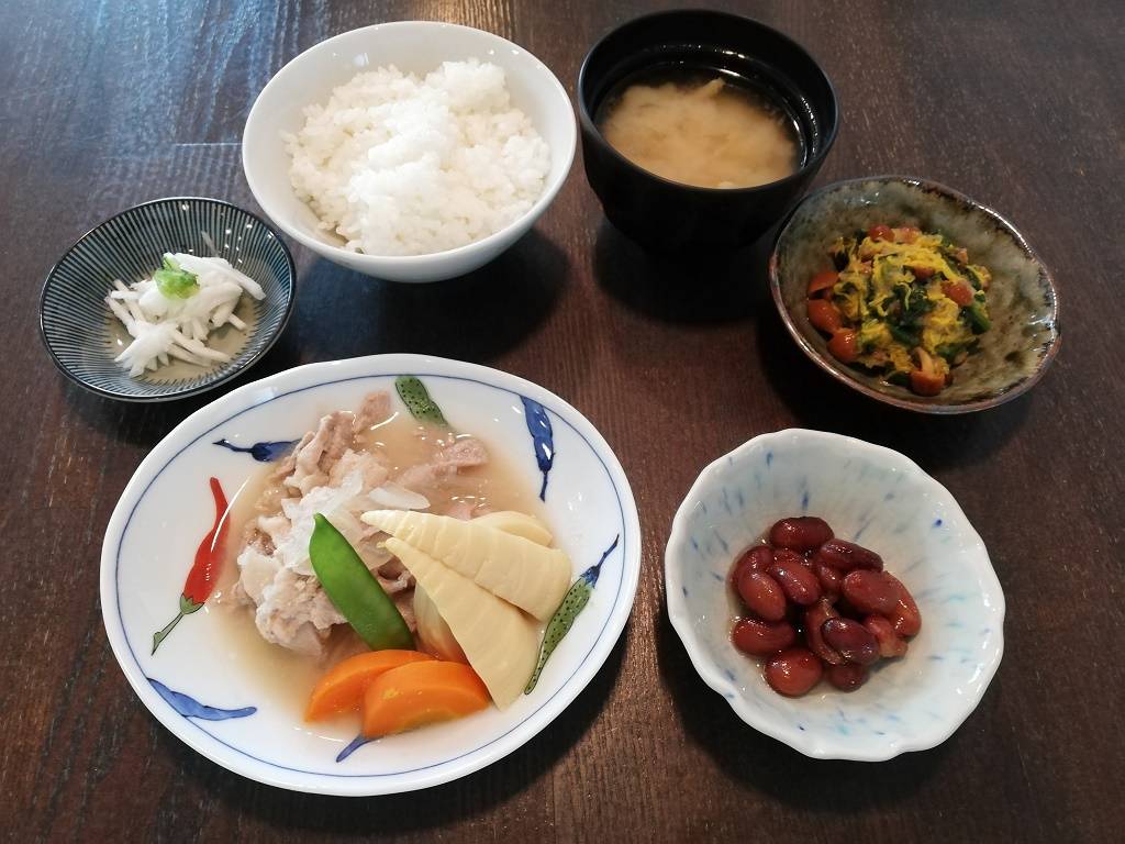 ごはん、キャベツのみそ汁、豚肉と筍の味噌煮、金時豆甘煮、なめこおろし和え、白かぶ漬け