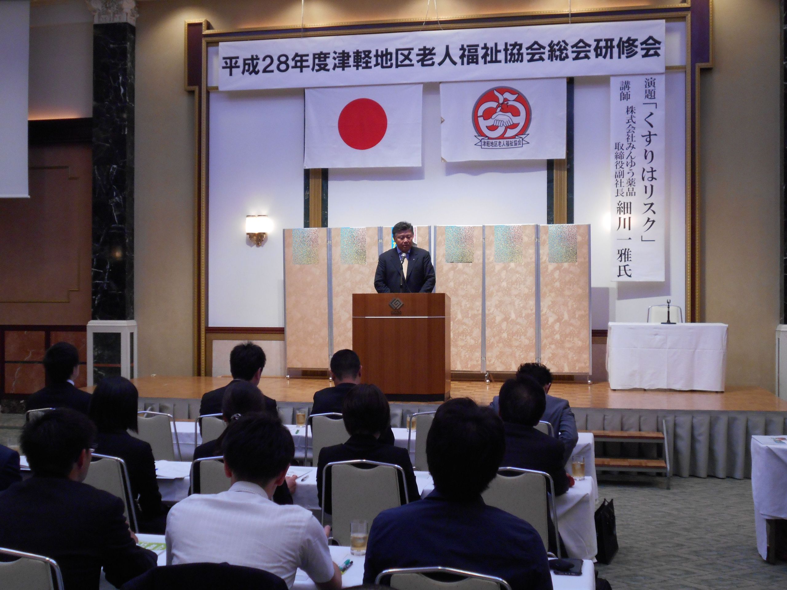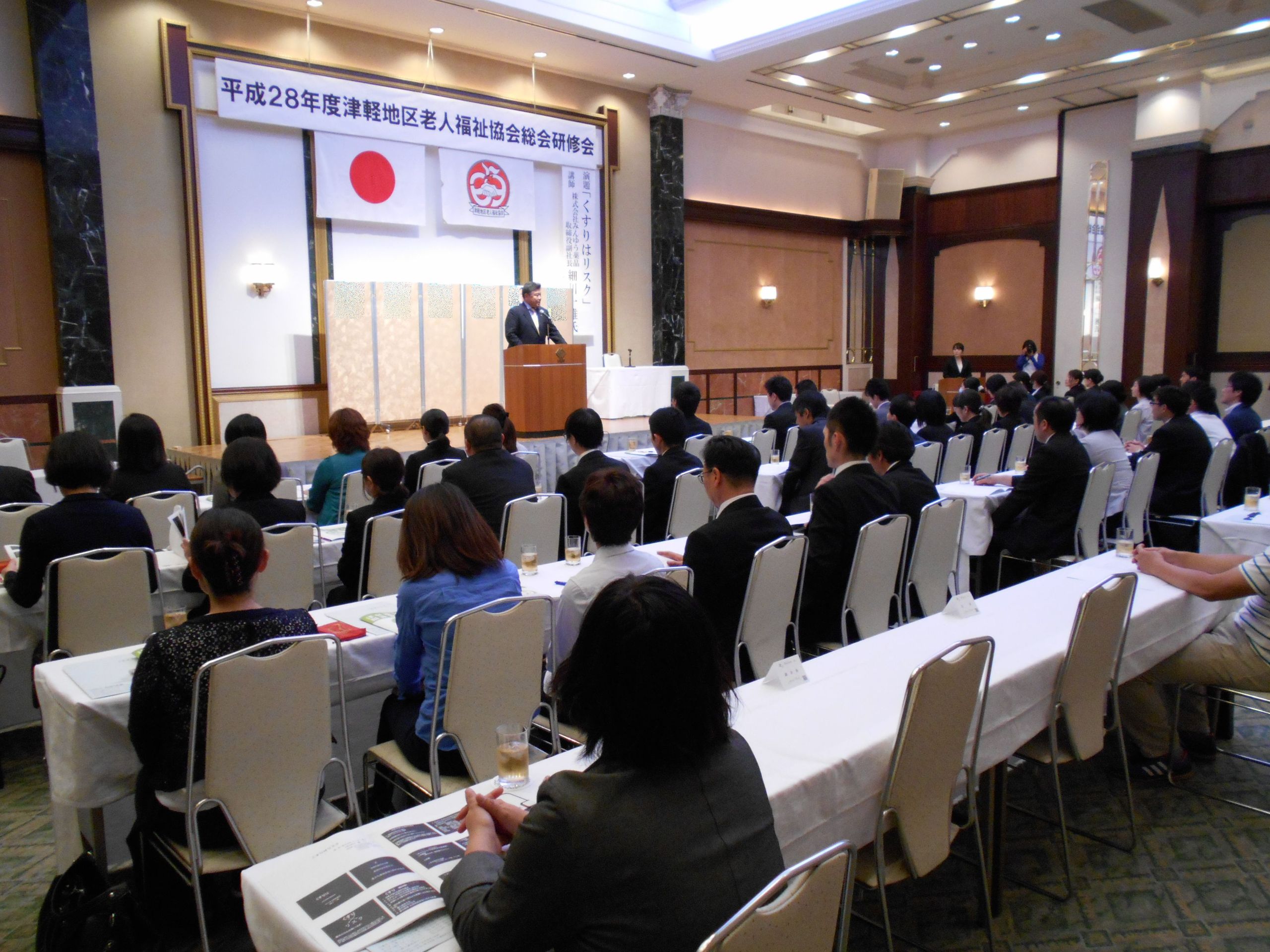 平成28年度津軽地区老人福祉協会総会研修会がフォルトーナで開催され、津軽地区の社会福祉法人立の特別養護老人ホーム等約30施設の方々が参加されました。三上貴生会長(おうよう園理事長)の挨拶に始まり、総会が行われた後株式会社みんゆう薬局様により「くすりはリスク」と題しました講演が行われました。講演では、薬の作用・副作用、効果、薬の物理・化学的安定性に対する影響等について学びました。たくさんの薬やサプリメントがある中で、その薬やサプリメントの特性を理解し、正しい知識を習得することにより、色々なリスクを回避出来ると思いました。今後もまた、「くすりはリスク」についての研修等がありましたら、是非参加させていただきたいと思いました。
