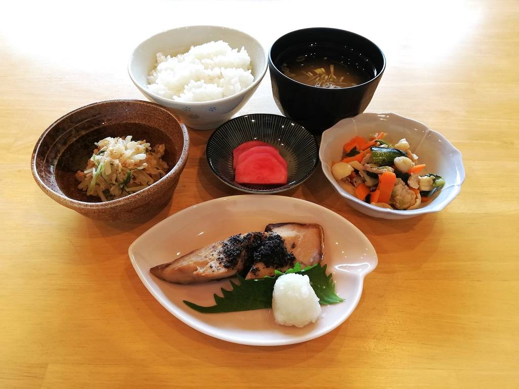 ごはん、わらびのみそ汁、あじの南部焼き、青梗菜の炒め物、はりはりサラダ、赤かぶ漬け