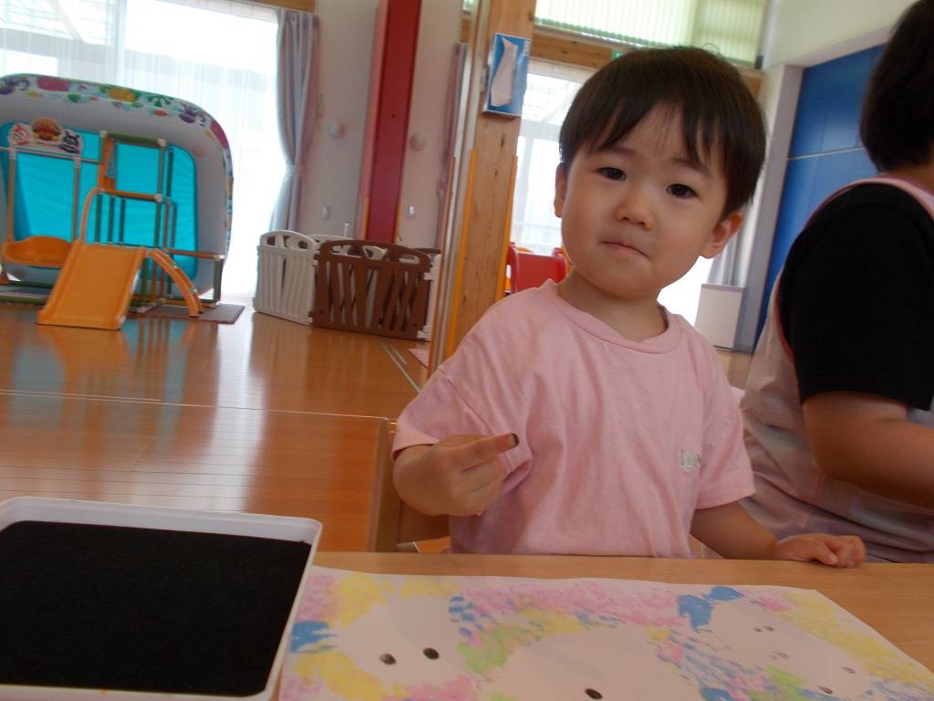 指スタンプで目と可愛いほっぺを描き、お口を貼って完成☆