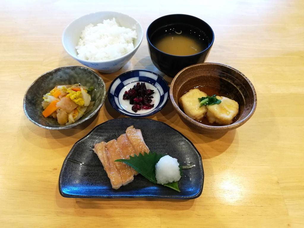 ごはん、じゃが芋のみそ汁、鶏肉の照り焼き、揚げ出し豆腐、白菜の数の子和え、しば漬け