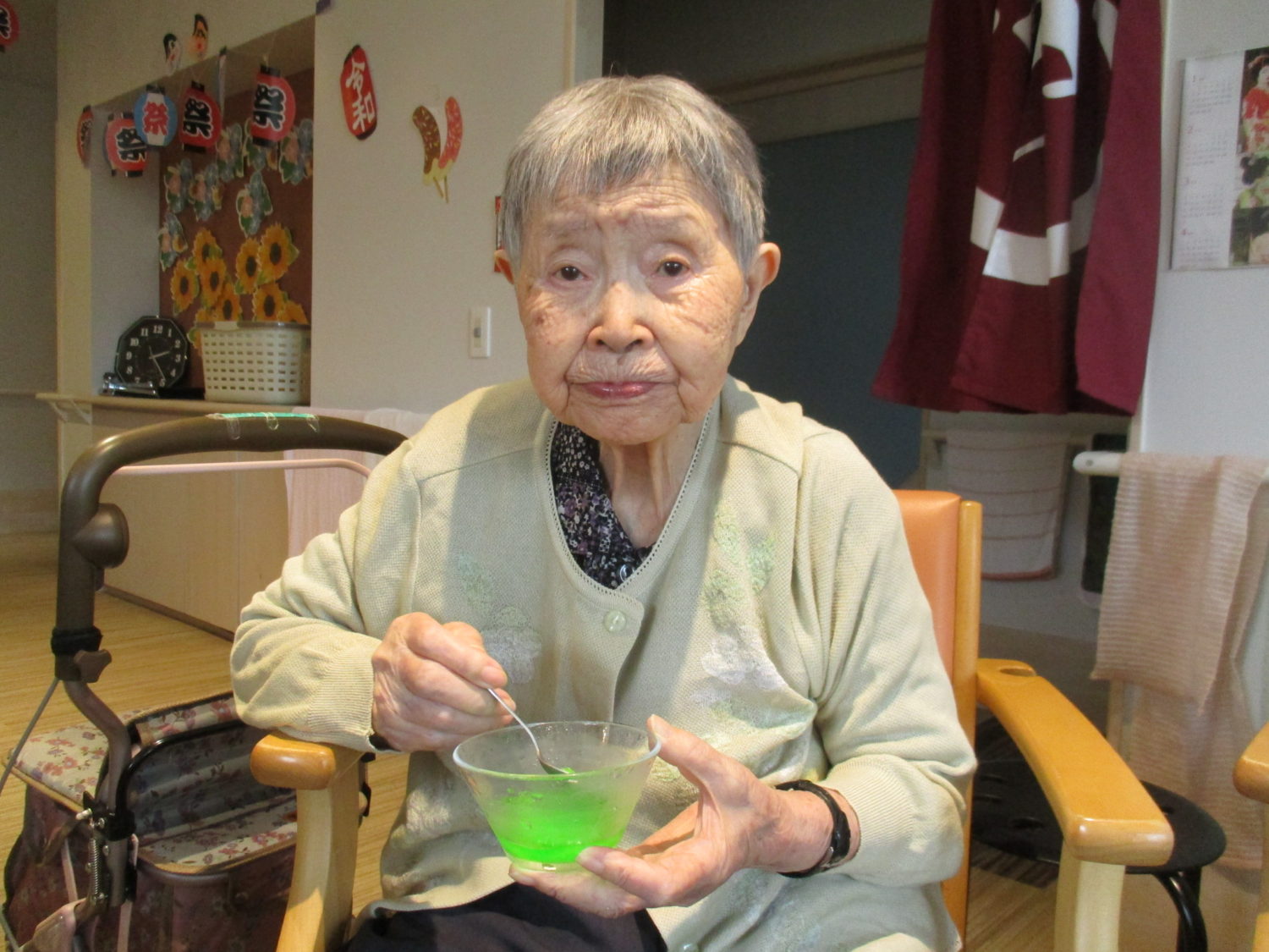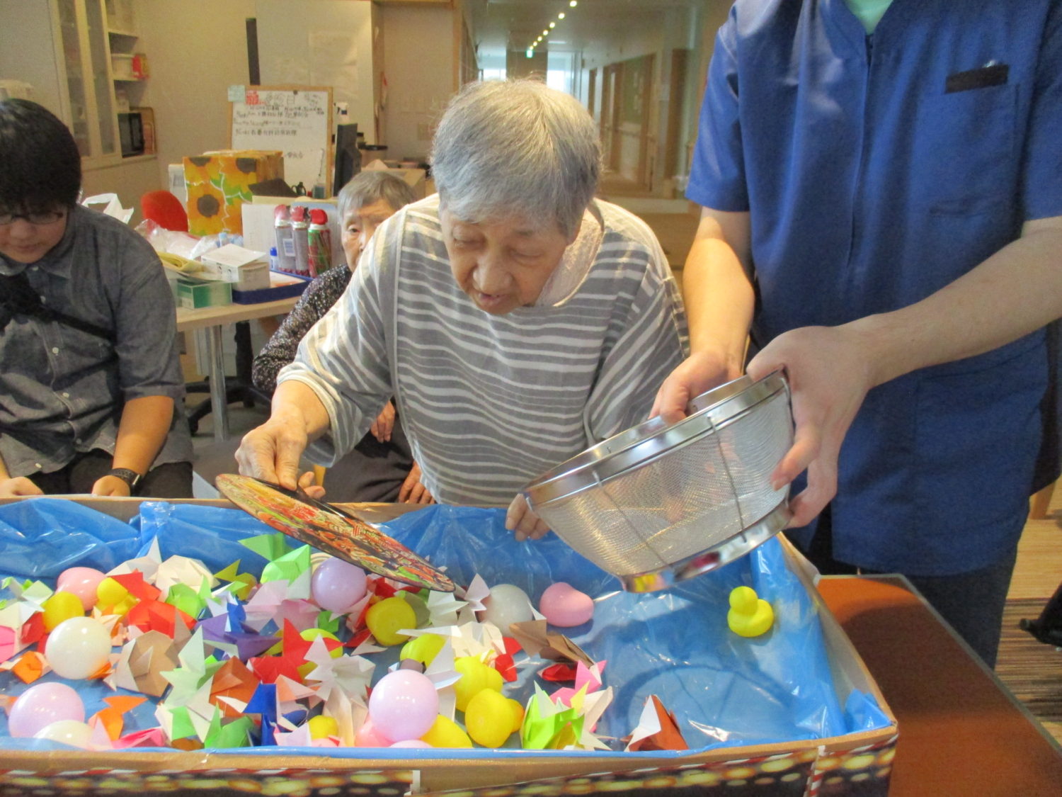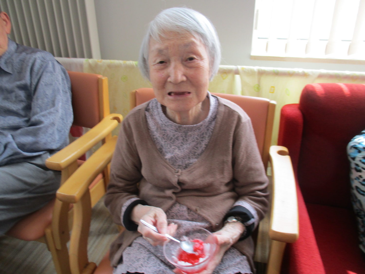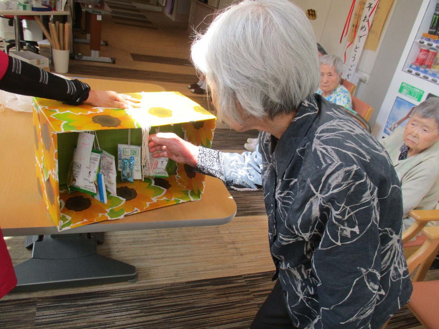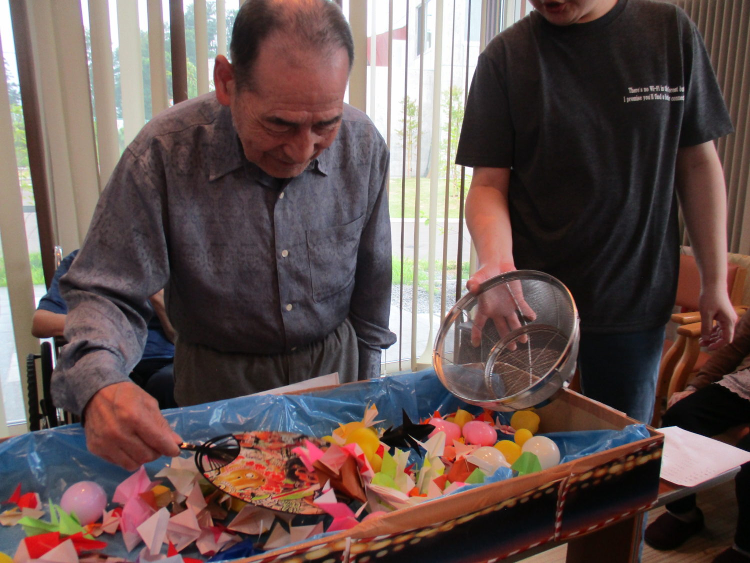 そこでささやかではありますが、ミニ縁日を行いお祝いを致しました。わなげや・金魚すくいゲーム・糸引きくじ・かき氷を提供させて頂きました。わなげはなかなか入らず苦戦していましたが、K様が100点と高得点を取ると大盛り上がりでした。糸引きくじでは皆様お菓子を目指して引いていましたが、ティッシュが当たると「もう1回」とおっしゃっていました。