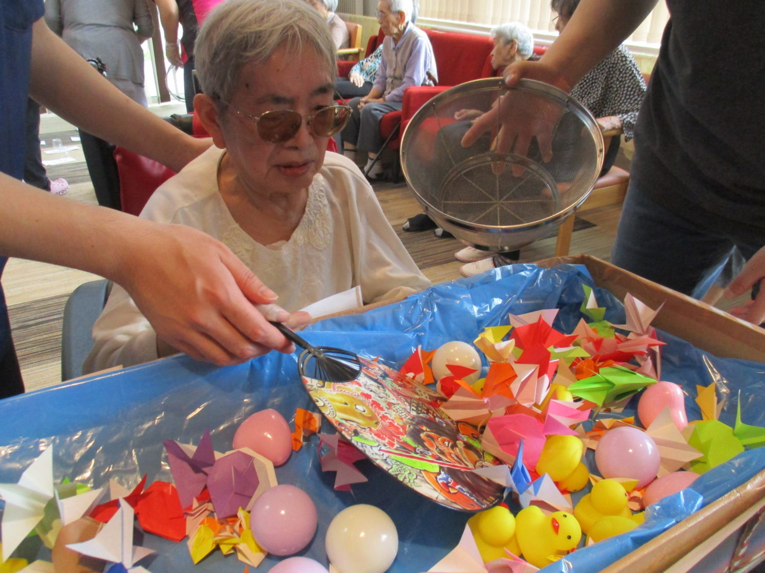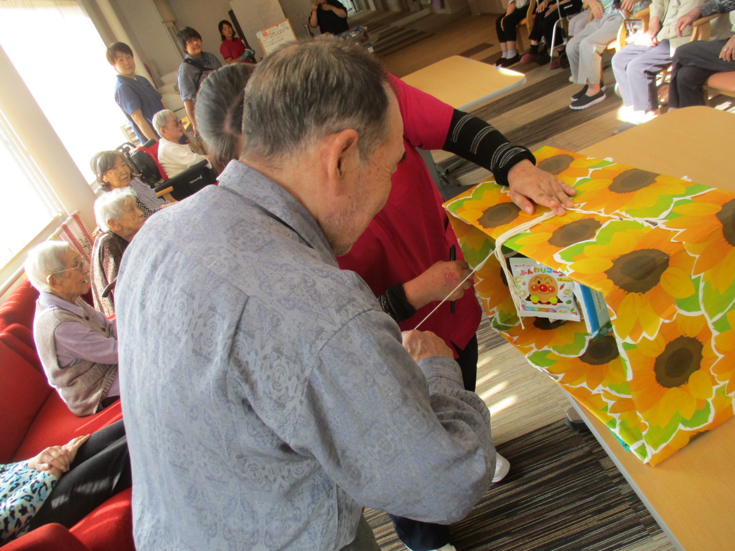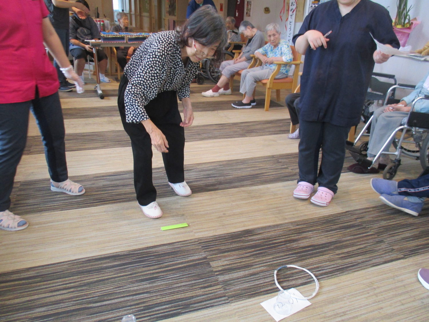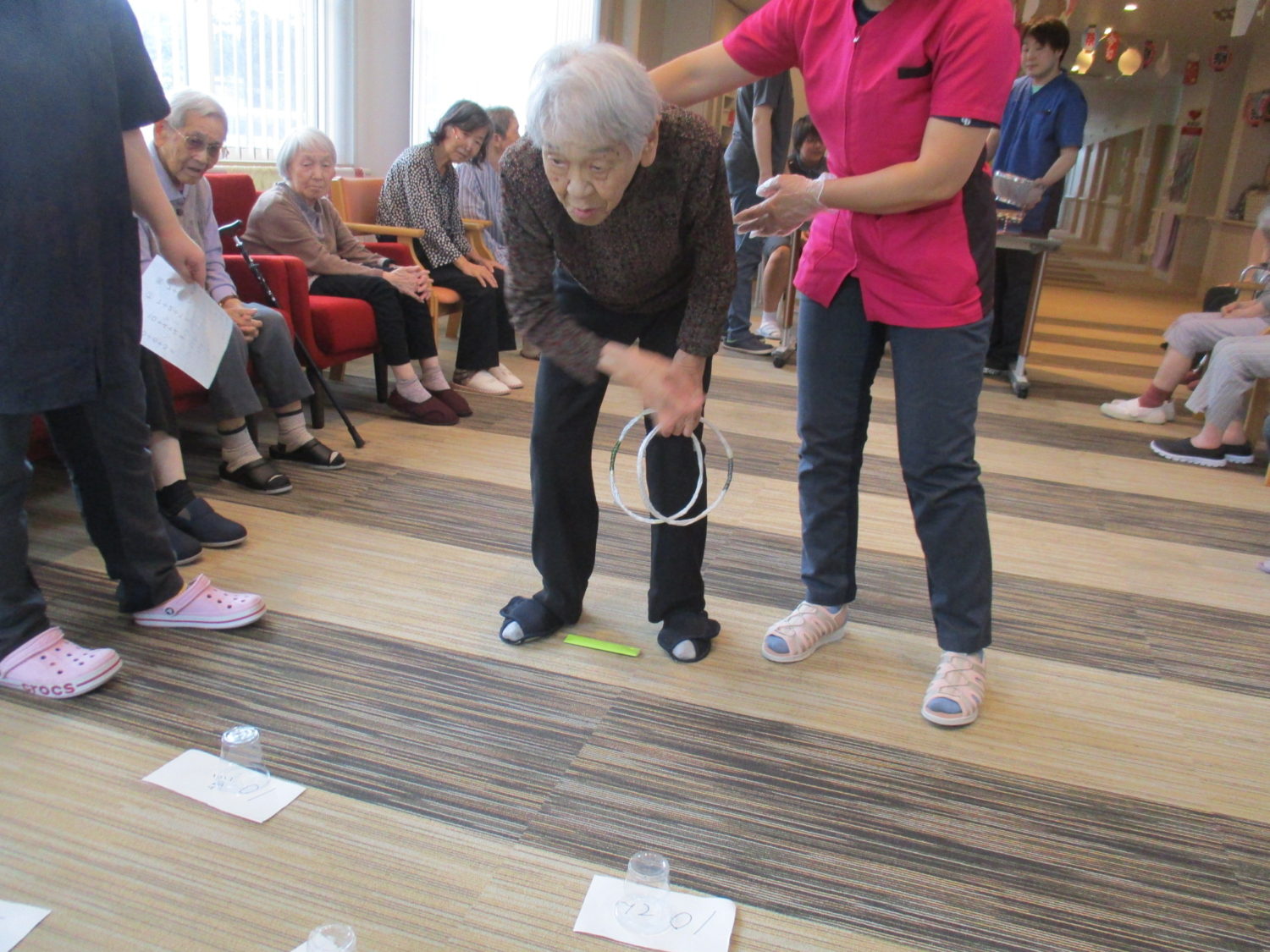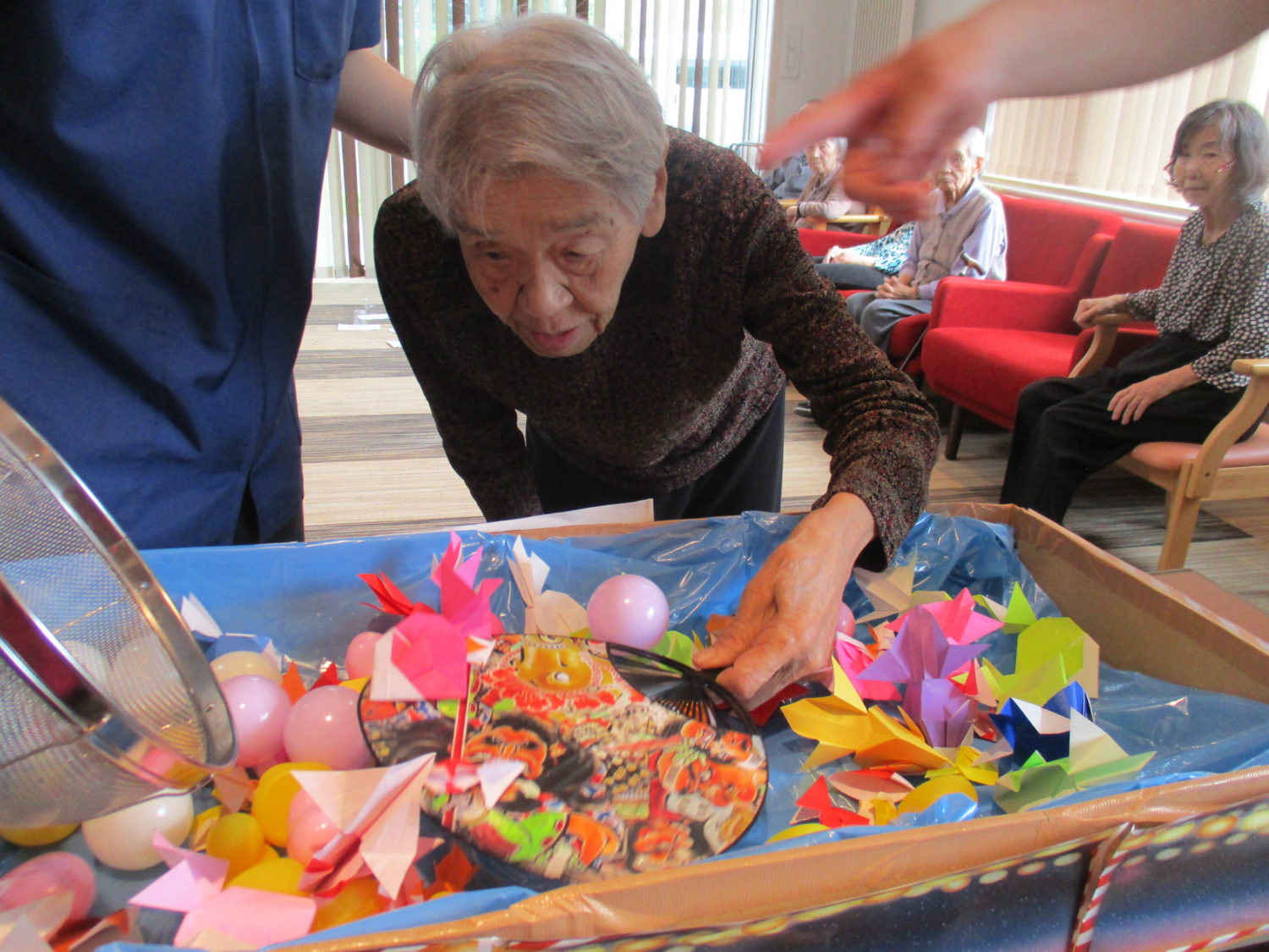 そこでささやかではありますが、ミニ縁日を行いお祝いを致しました。わなげや・金魚すくいゲーム・糸引きくじ・かき氷を提供させて頂きました。わなげはなかなか入らず苦戦していましたが、K様が100点と高得点を取ると大盛り上がりでした。糸引きくじでは皆様お菓子を目指して引いていましたが、ティッシュが当たると「もう1回」とおっしゃっていました。