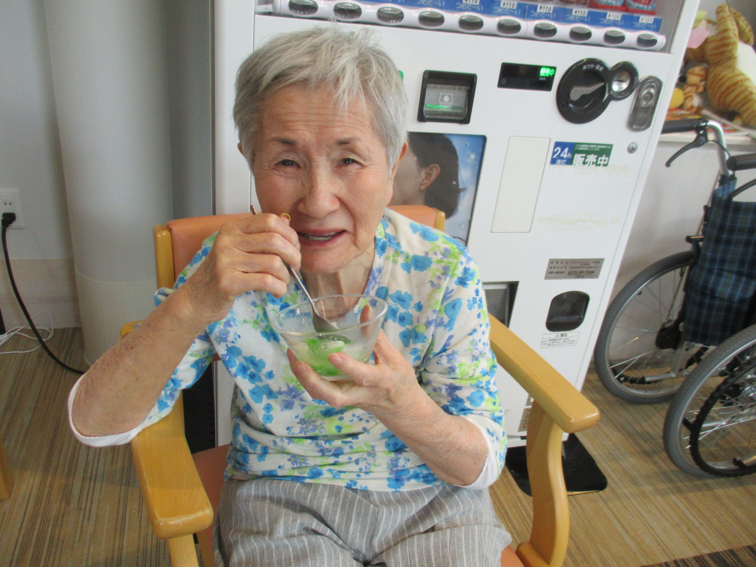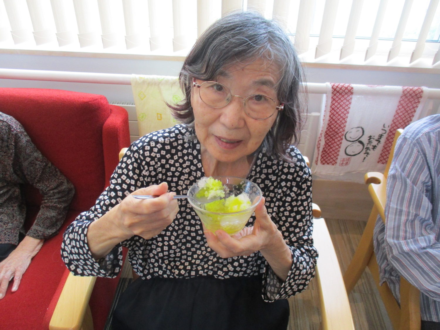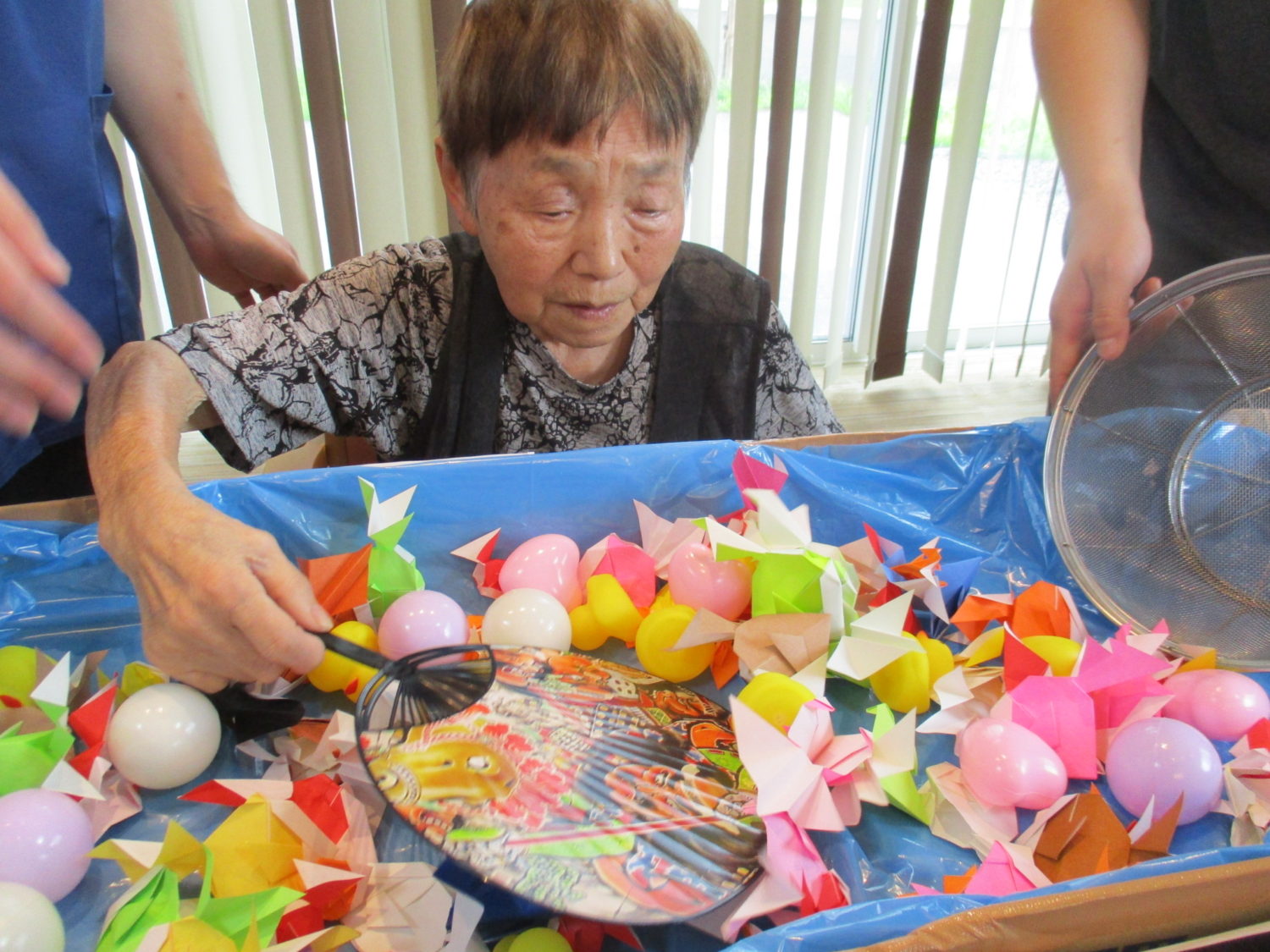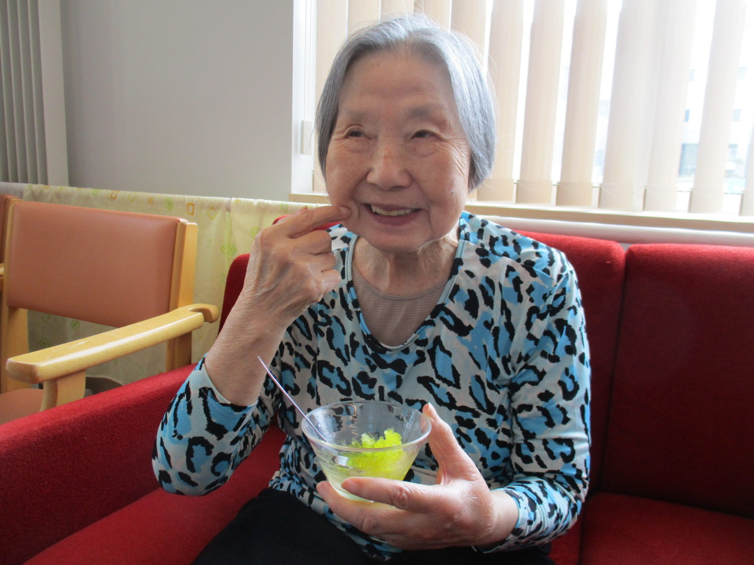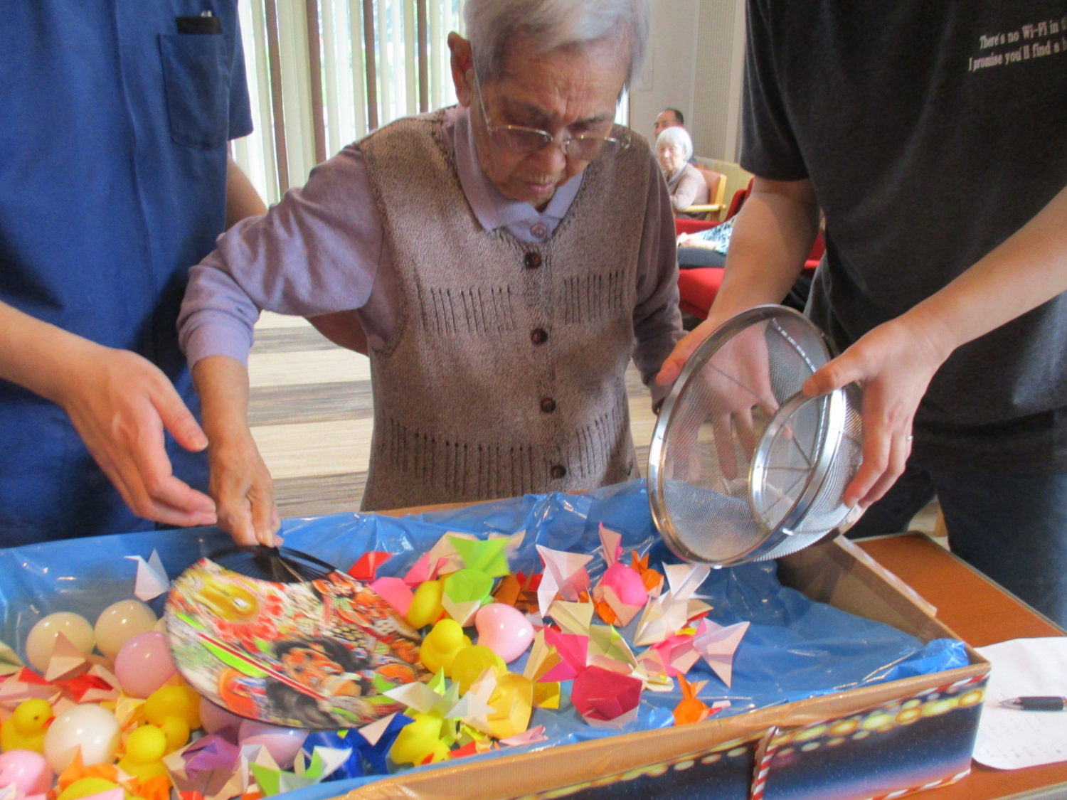 そこでささやかではありますが、ミニ縁日を行いお祝いを致しました。わなげや・金魚すくいゲーム・糸引きくじ・かき氷を提供させて頂きました。わなげはなかなか入らず苦戦していましたが、K様が100点と高得点を取ると大盛り上がりでした。糸引きくじでは皆様お菓子を目指して引いていましたが、ティッシュが当たると「もう1回」とおっしゃっていました。
