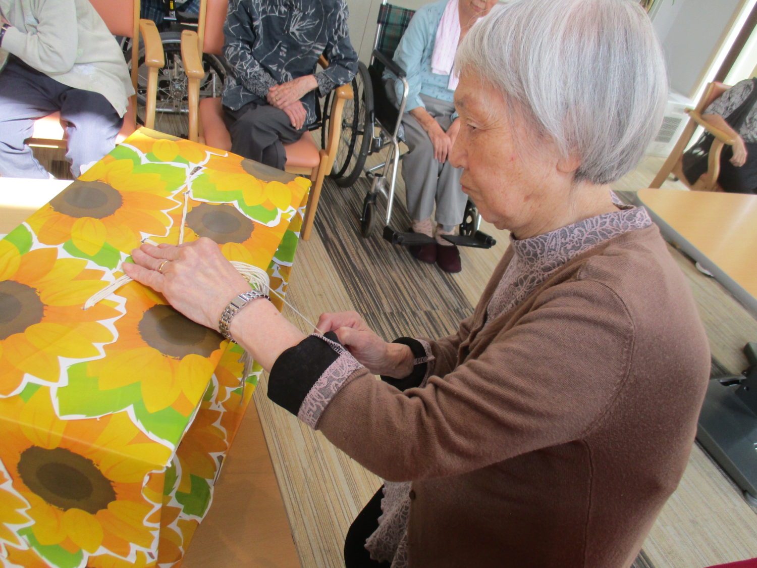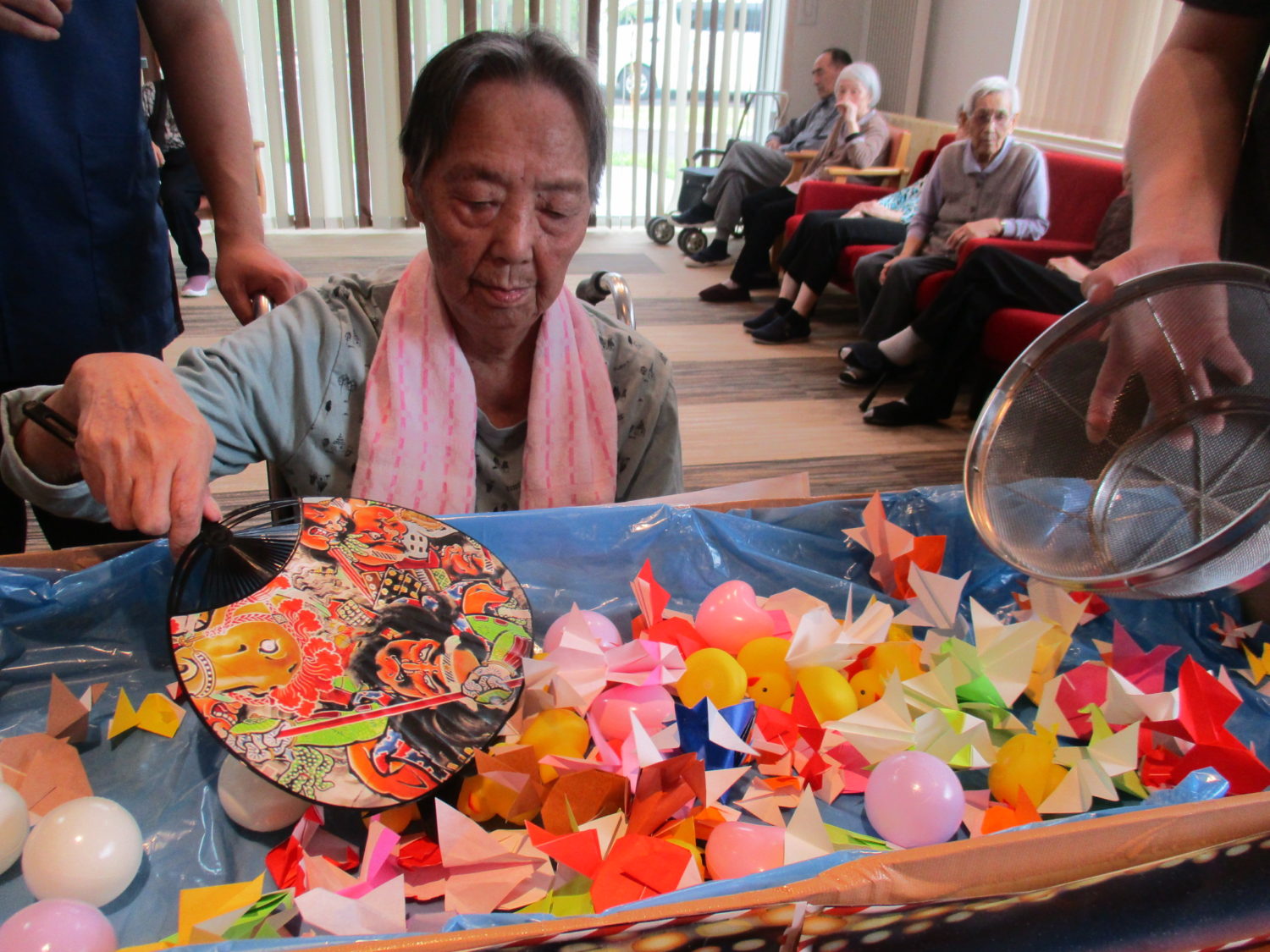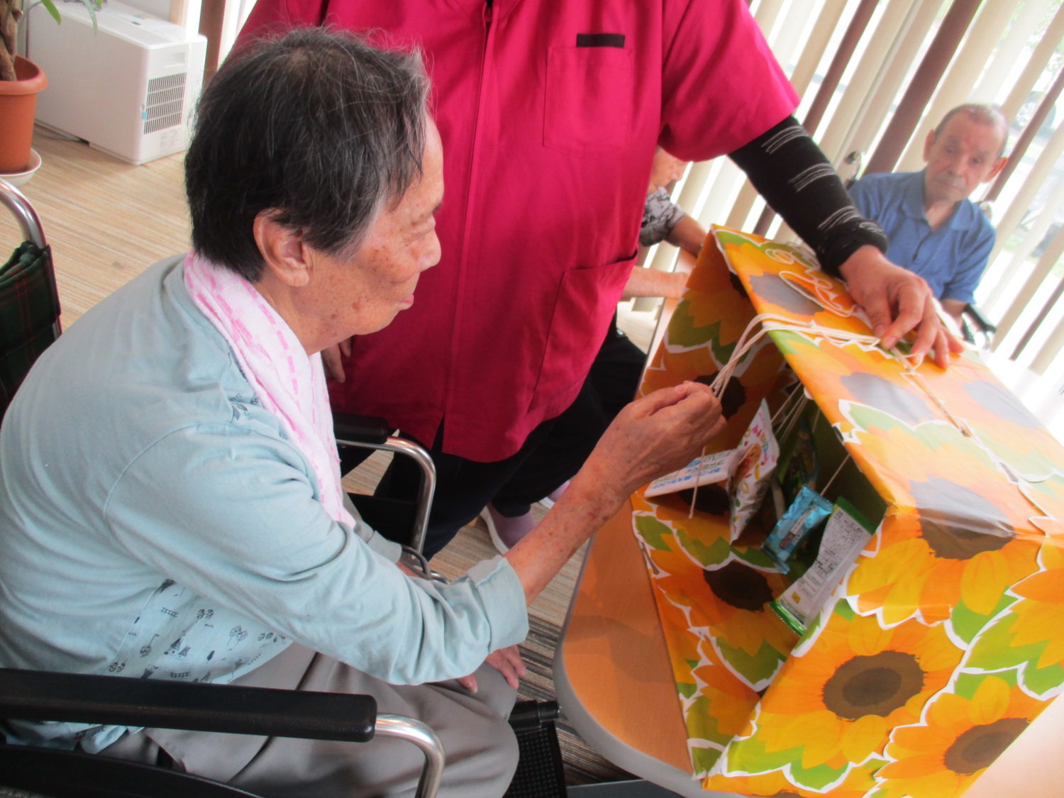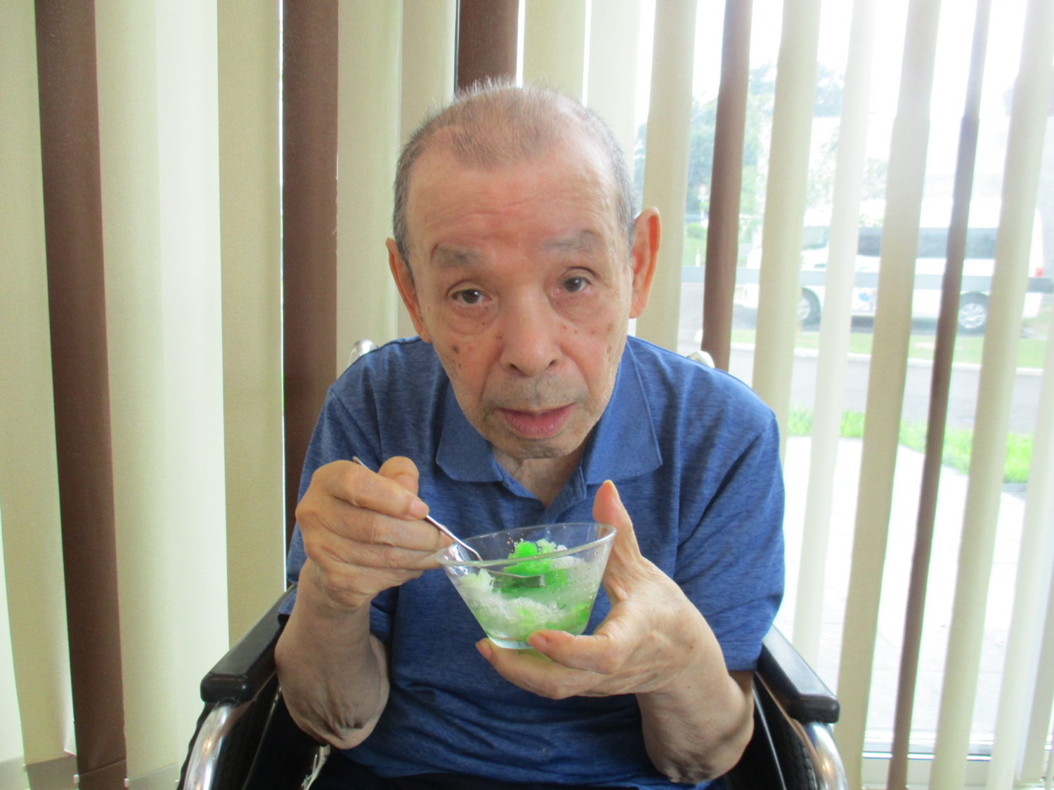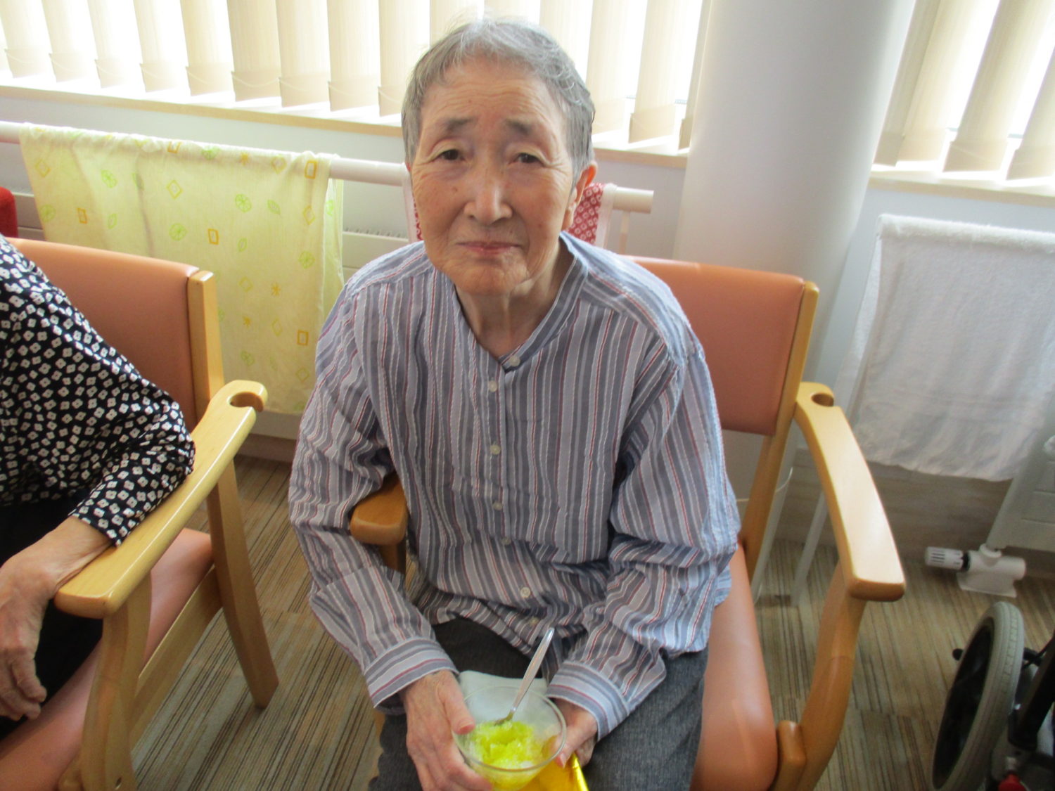 そこでささやかではありますが、ミニ縁日を行いお祝いを致しました。わなげや・金魚すくいゲーム・糸引きくじ・かき氷を提供させて頂きました。わなげはなかなか入らず苦戦していましたが、K様が100点と高得点を取ると大盛り上がりでした。糸引きくじでは皆様お菓子を目指して引いていましたが、ティッシュが当たると「もう1回」とおっしゃっていました。