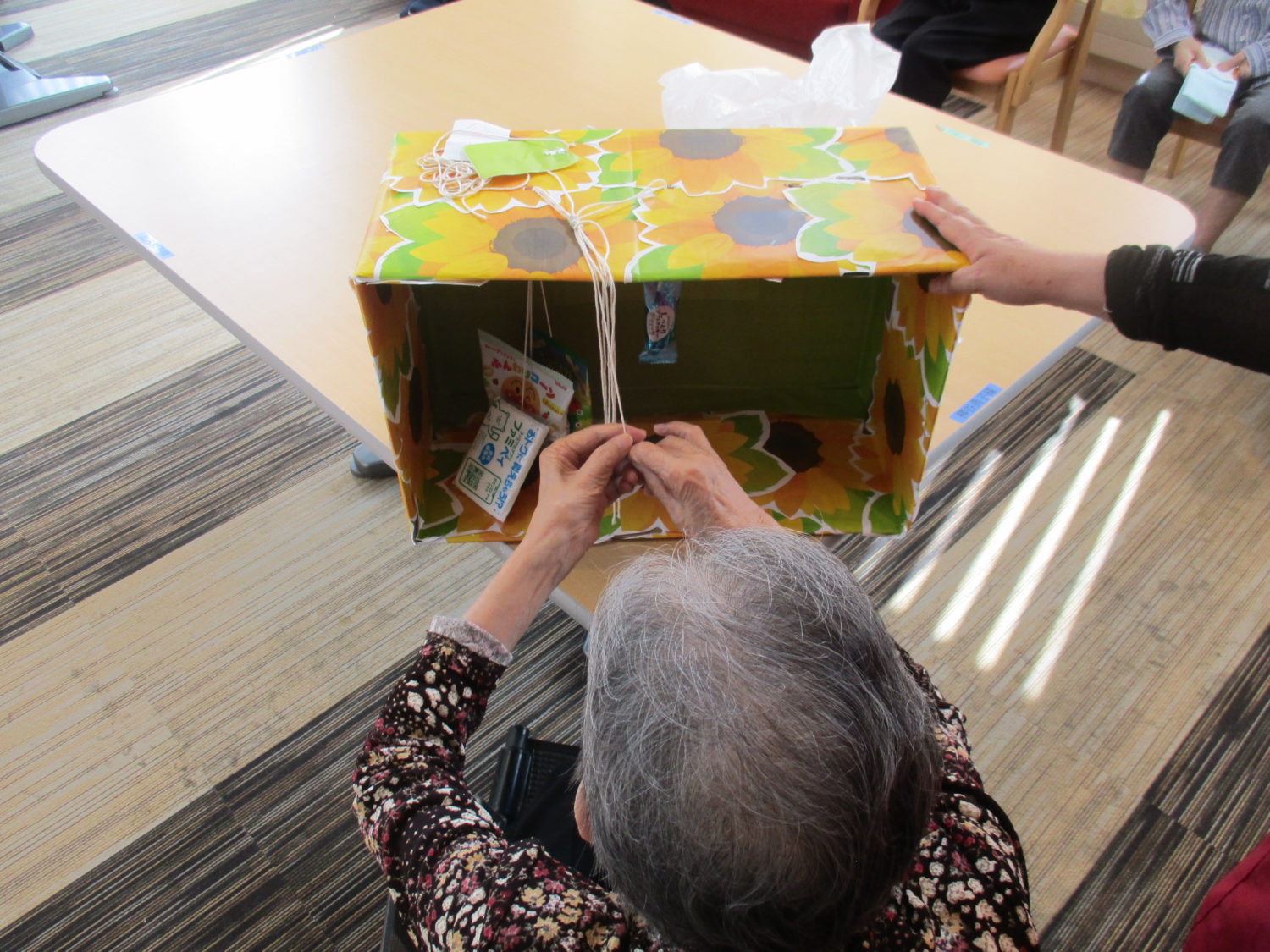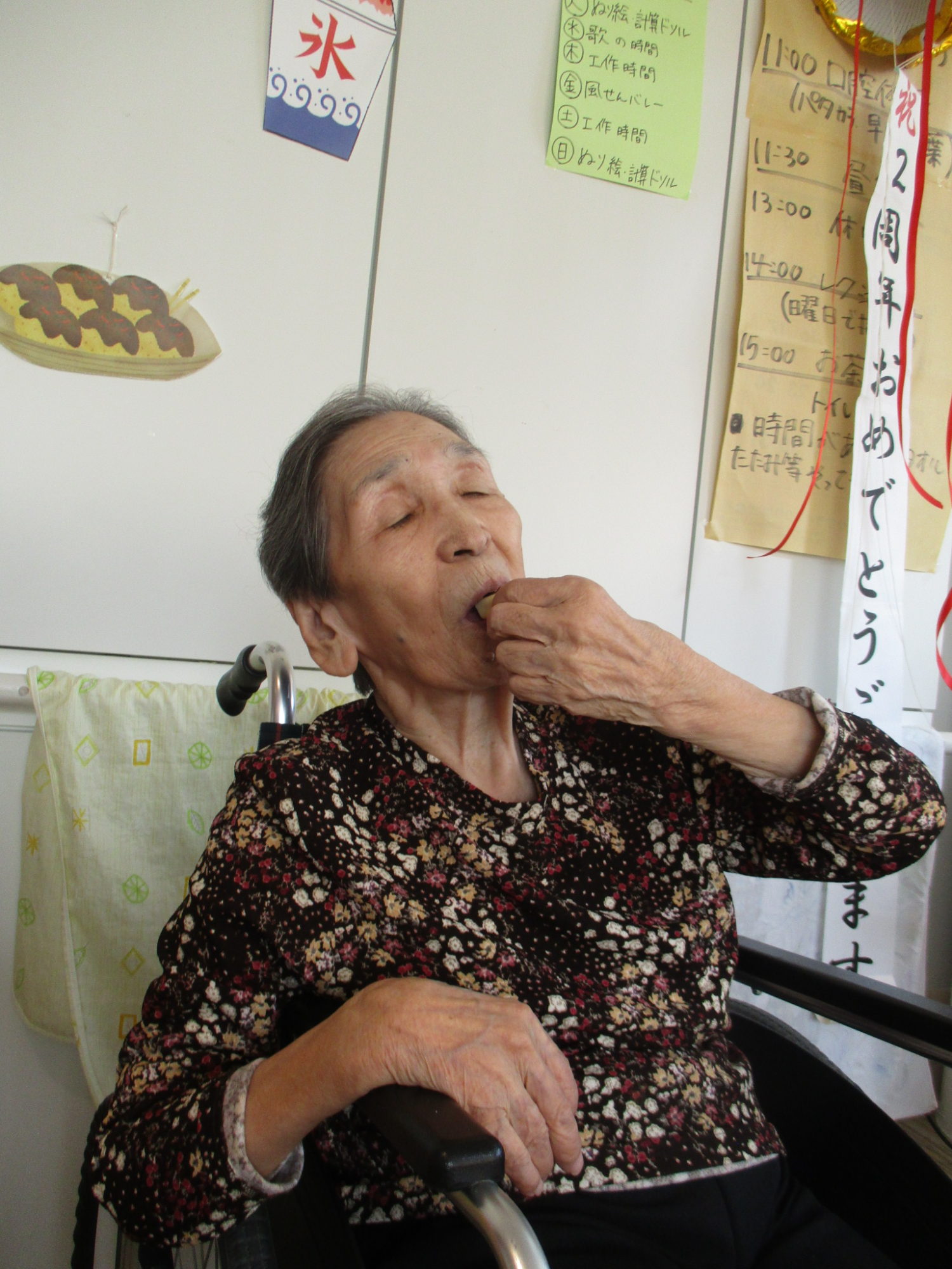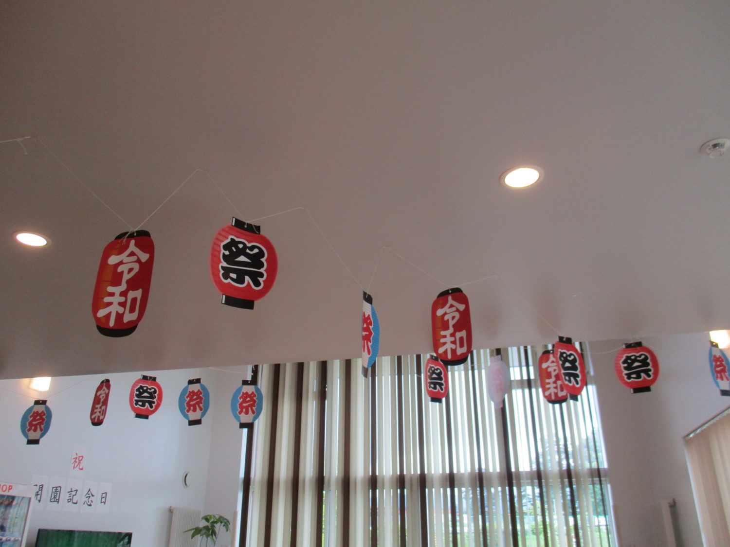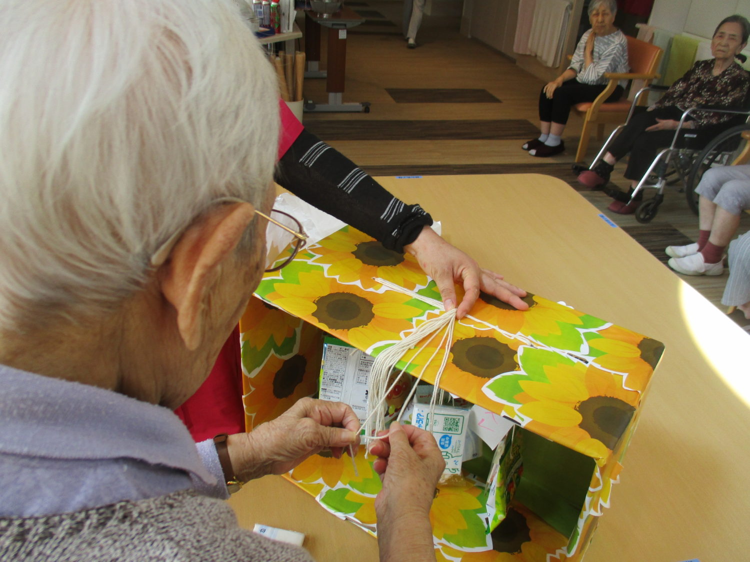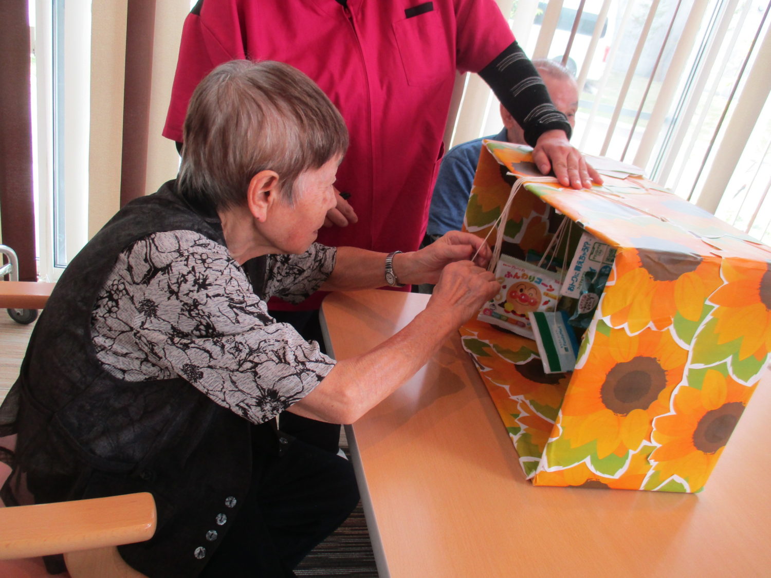 そこでささやかではありますが、ミニ縁日を行いお祝いを致しました。わなげや・金魚すくいゲーム・糸引きくじ・かき氷を提供させて頂きました。わなげはなかなか入らず苦戦していましたが、K様が100点と高得点を取ると大盛り上がりでした。糸引きくじでは皆様お菓子を目指して引いていましたが、ティッシュが当たると「もう1回」とおっしゃっていました。