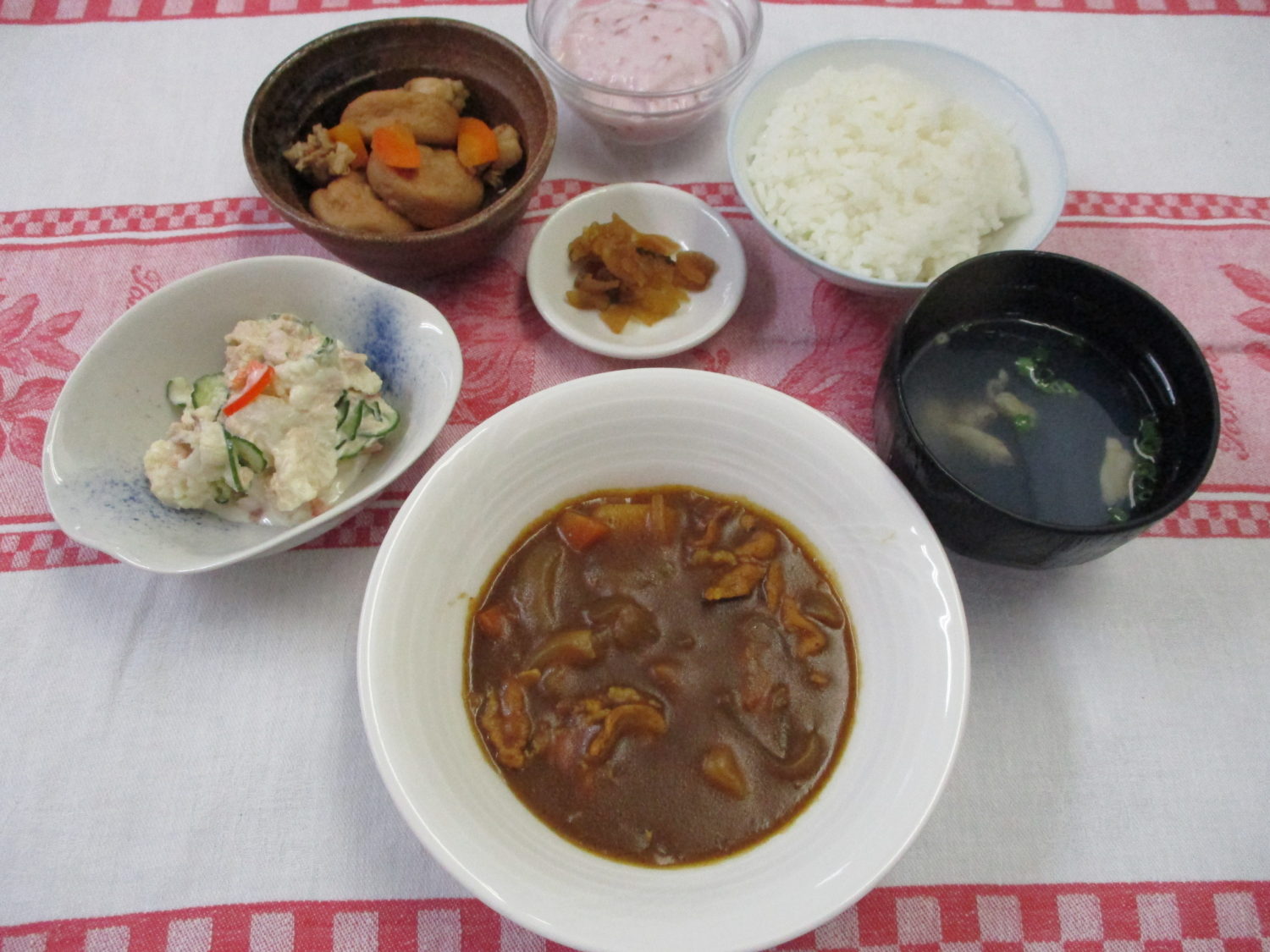 ご飯、あさりスープ、ポークカレー、カリフラワーとツナのサラダ、帆立とがんもの煮物、福神漬、いちごフルーチェ