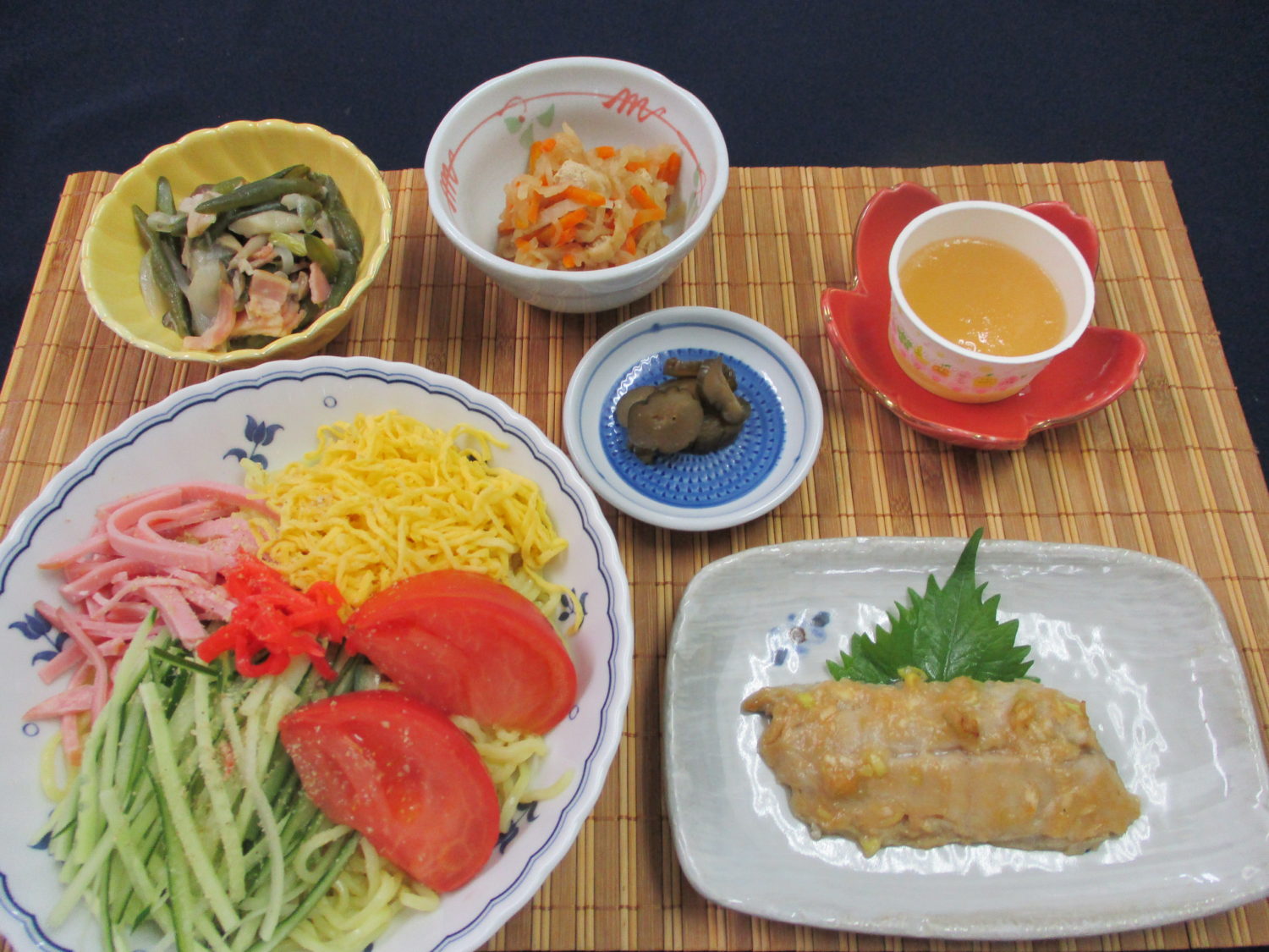 冷やし中華、さわらのねぎ味噌焼き、いんげんとベーコンのソテー、切干大根の煮物、相馬きゅうり漬、ピーチゼリー