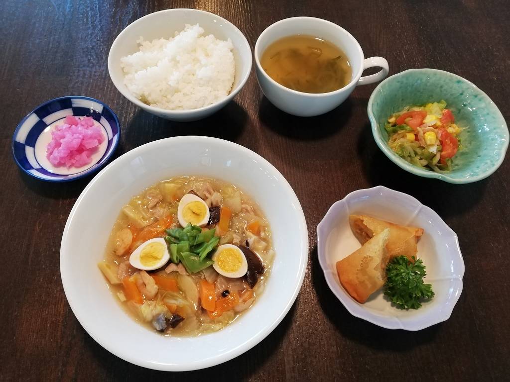 ごはん、めかぶと春雨のスープ、八宝菜、春巻き、レタスのサラダ、桜大根漬け