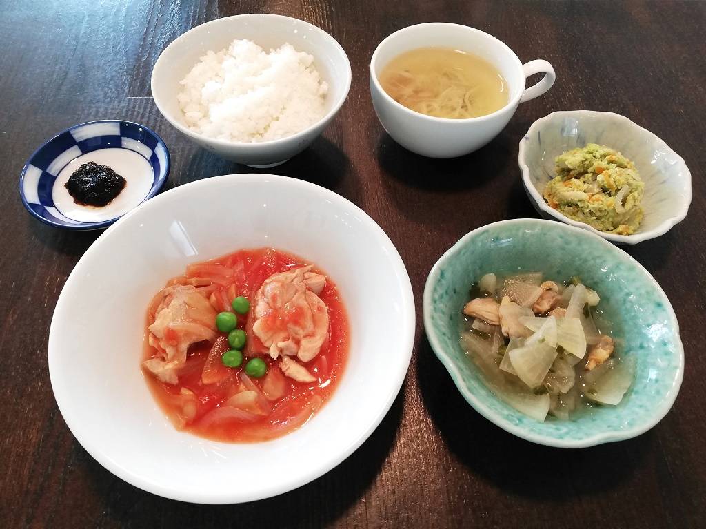 ごはん、キャベツのスープ、鶏肉のトマト煮、大根とあさりの煮物、ずんだ和え、のり佃煮