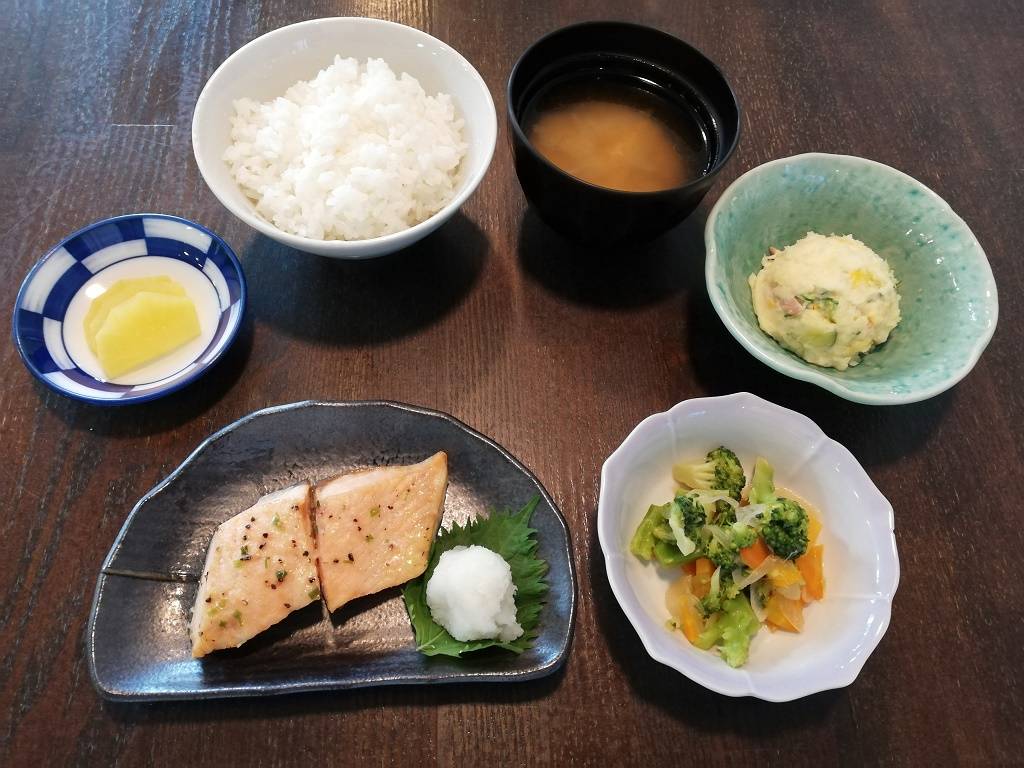 ごはん、もやしのみそ汁、鮭のねぎ塩焼き、ブロッコリーのソテー、ポテトサラダ、