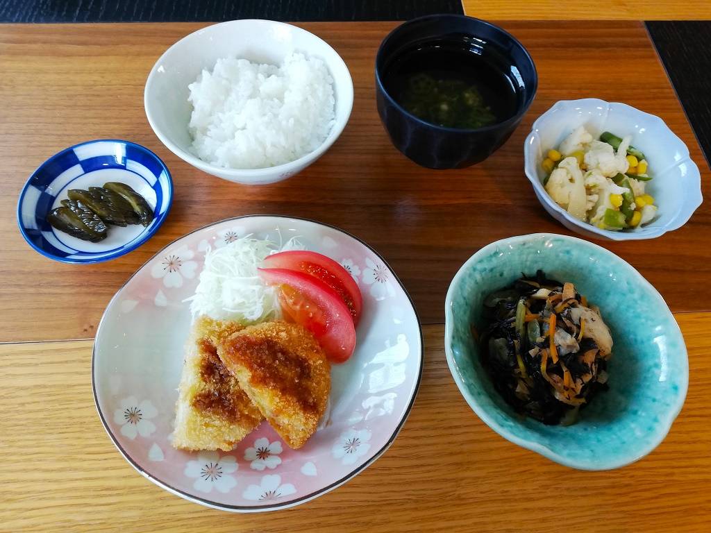 ごはん、オクラのすまし汁、コロッケ、ひじきの旨煮、カリフラワーサラダ、味きゅうり漬け