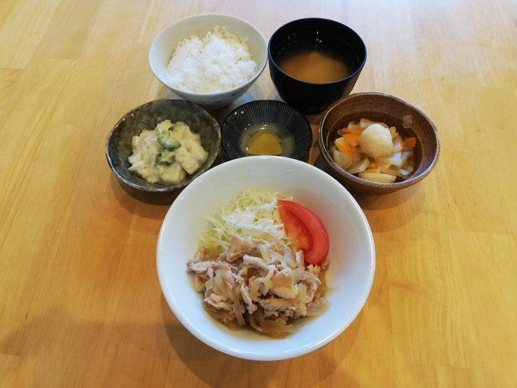 ごはん、豆腐のみそ汁、豚肉の生姜焼き、つみれのスープ煮、長芋のサラダ、かつおたくあん漬け