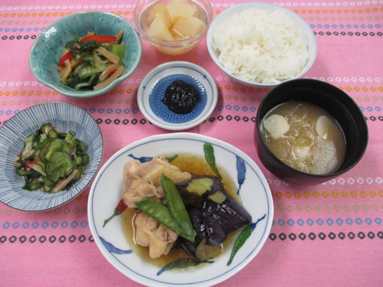 ご飯、里芋とねぎのみそ汁、鶏肉となすのうま煮、チンゲン菜とメンマのソテー、胡瓜とたこの和え物、のり佃煮、白桃缶