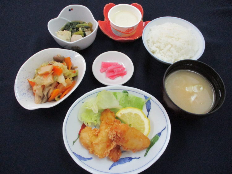 ご飯、豆腐とねぎのみそ汁、鶏天ぷら、キャベツとさつま揚げの炒め煮、里芋といかの煮物、